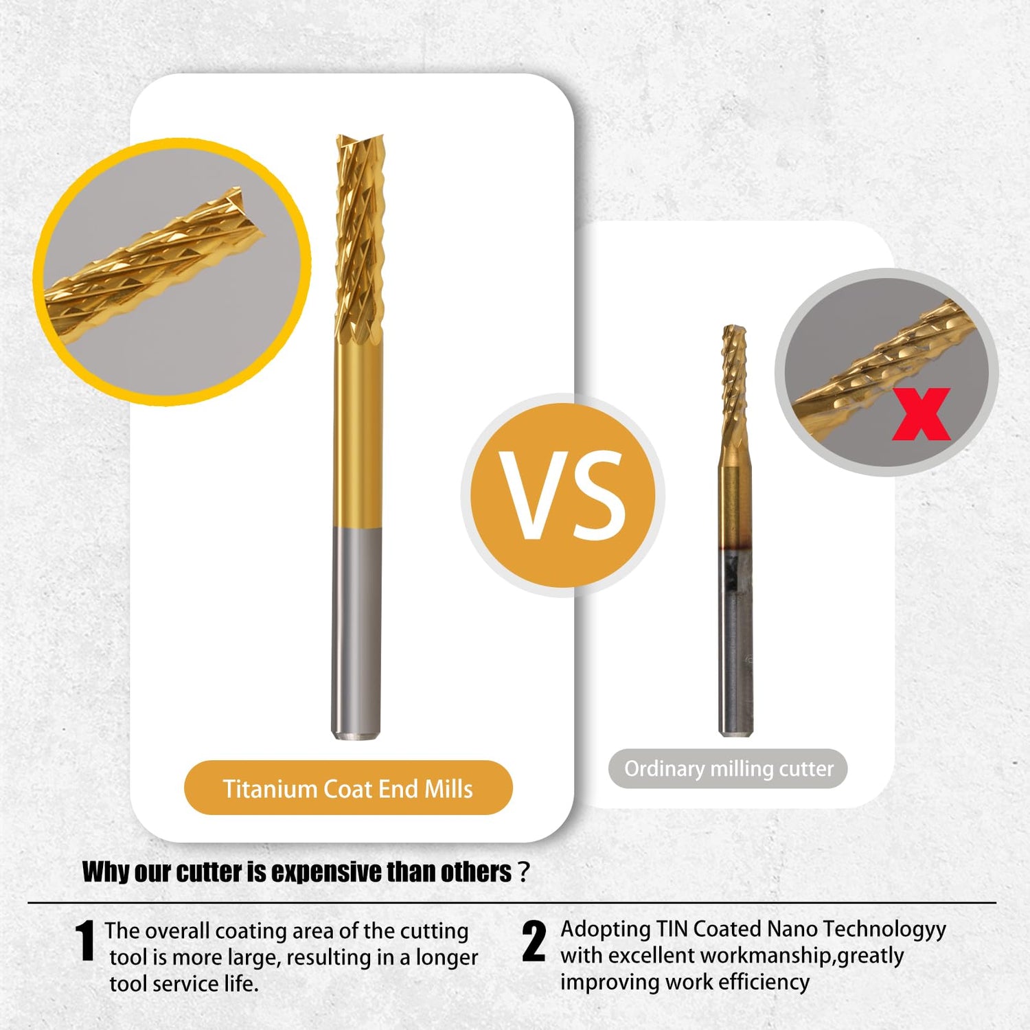 - 【High Quality CNC Bits】HOZLY 1/8 end mills are made of ultra-fine grain carbide material (tungsten steel), Titanium Coat,More longer service life.with highly wear resistance, high hardness, bending strength, highly working efficiency, highly precision