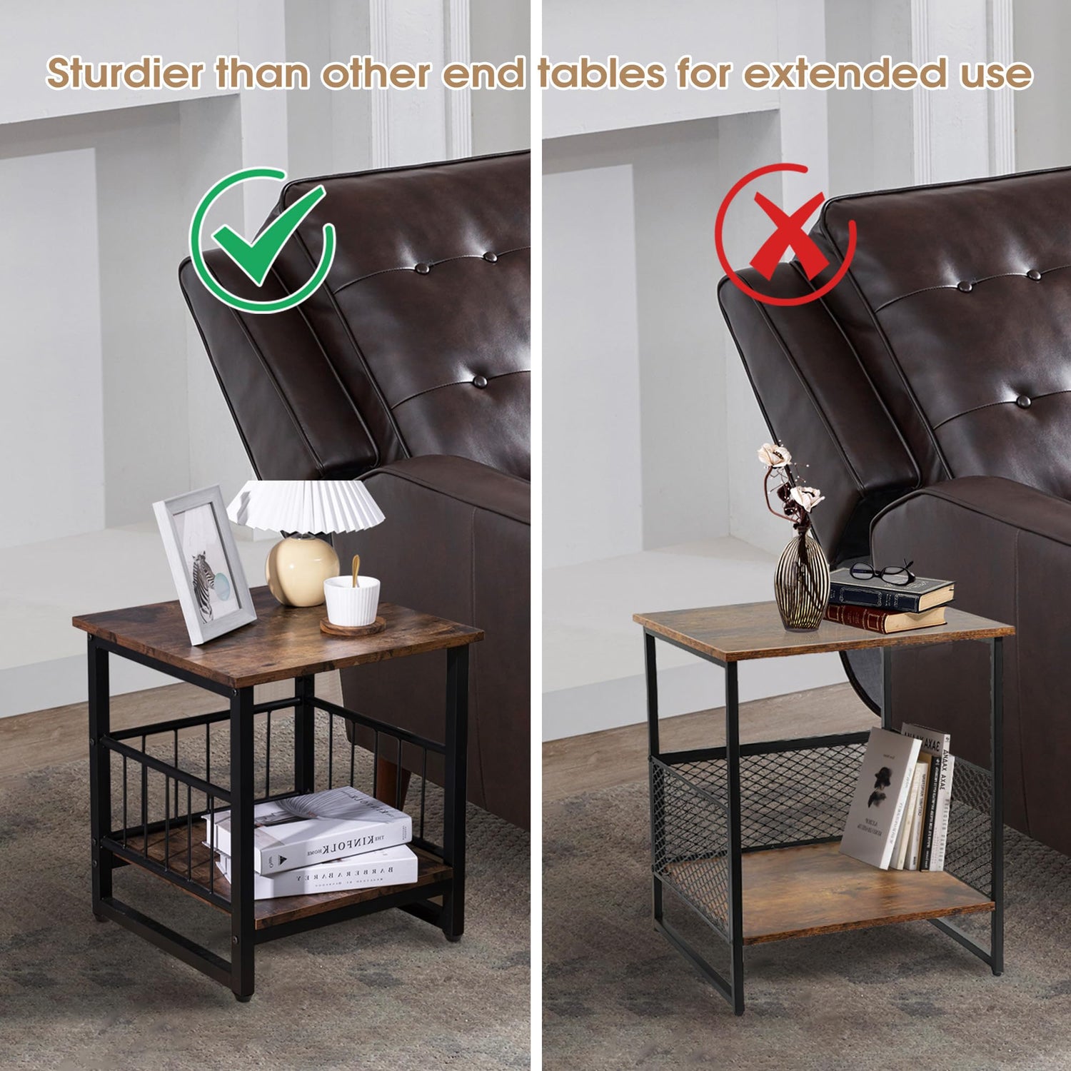 End Table, Industrial Side Table with 2-Tire Storage Shelf, 180LBS Mini Fridge Stand with Adjustable Feet, 18"x18" Wood Night Stand Small Bedside Table with Sturdy Metal Frame for Living Room Bedroom