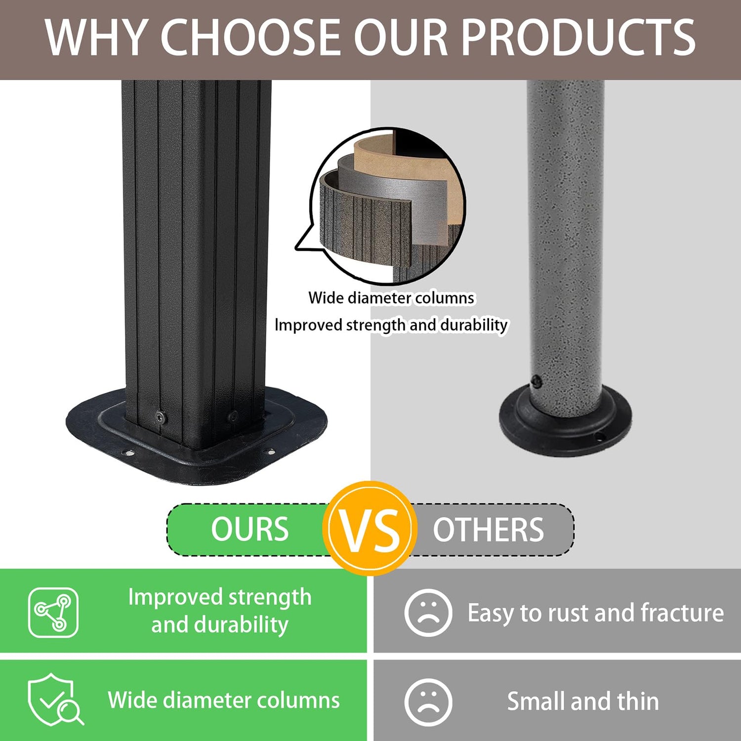 - 【STURDY ALIMINUM FRAME】 This outdoor gazebo comes with the attractive powder coat, making the real aluminum posts more unique and not easy to rust or corrode. (Pre-drilled base and expansion screws are provided. )