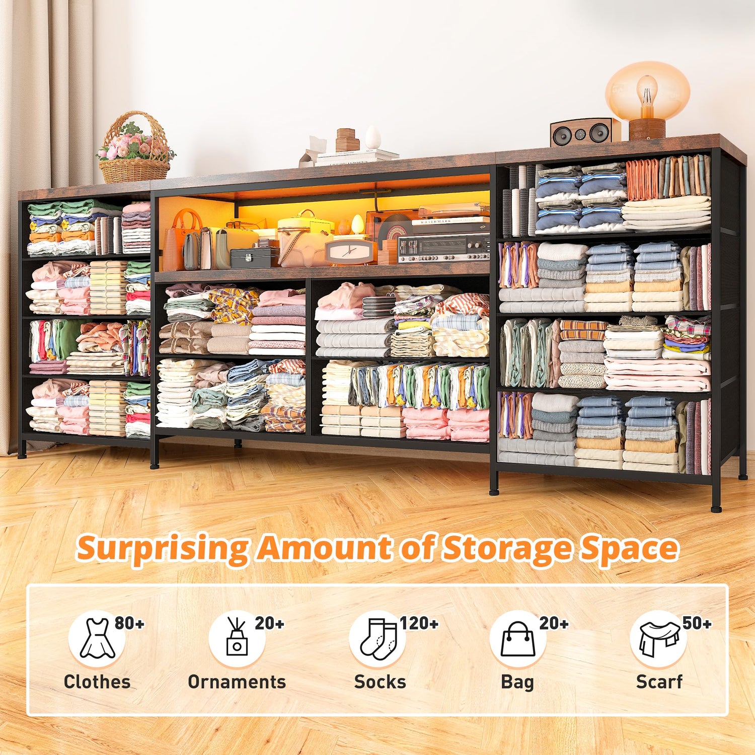 EnHomee 12 Drawer Dresser TV Stand for 65 70 75 Inch TV 63" W Extra Long Dresser for Bedroom with LED Lights & Power Outlets Entertainment Center with Fabric Drawers for Closet Rustic Brown