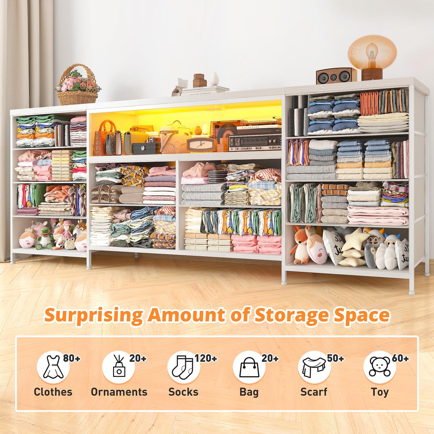 EnHomee 12 Drawer Dresser TV Stand for 65 70 75 Inch TV, 63" W Extra Long White Dresser for Bedroom with LED Lights & Power Outlets, Entertainment Center with Drawers, Fabric Dresser for Closet