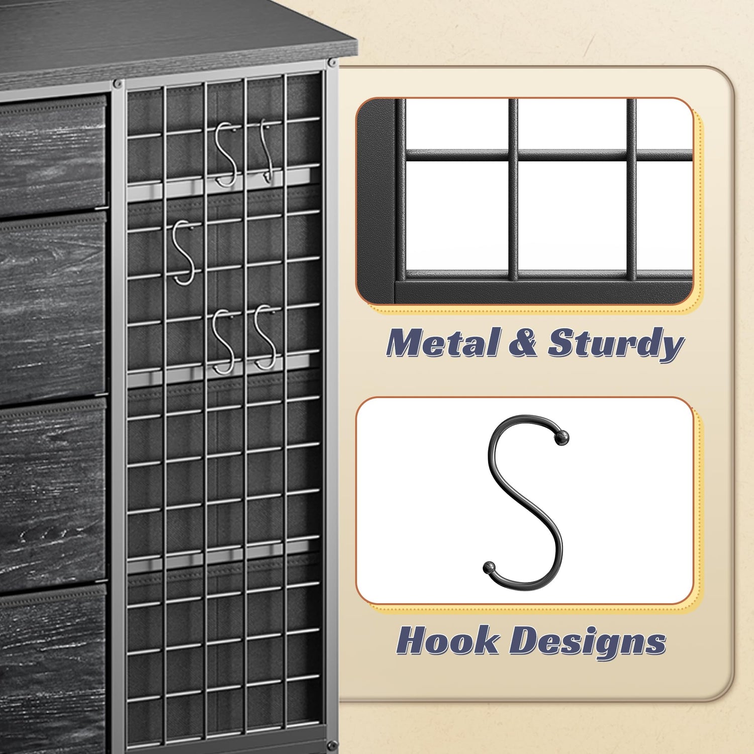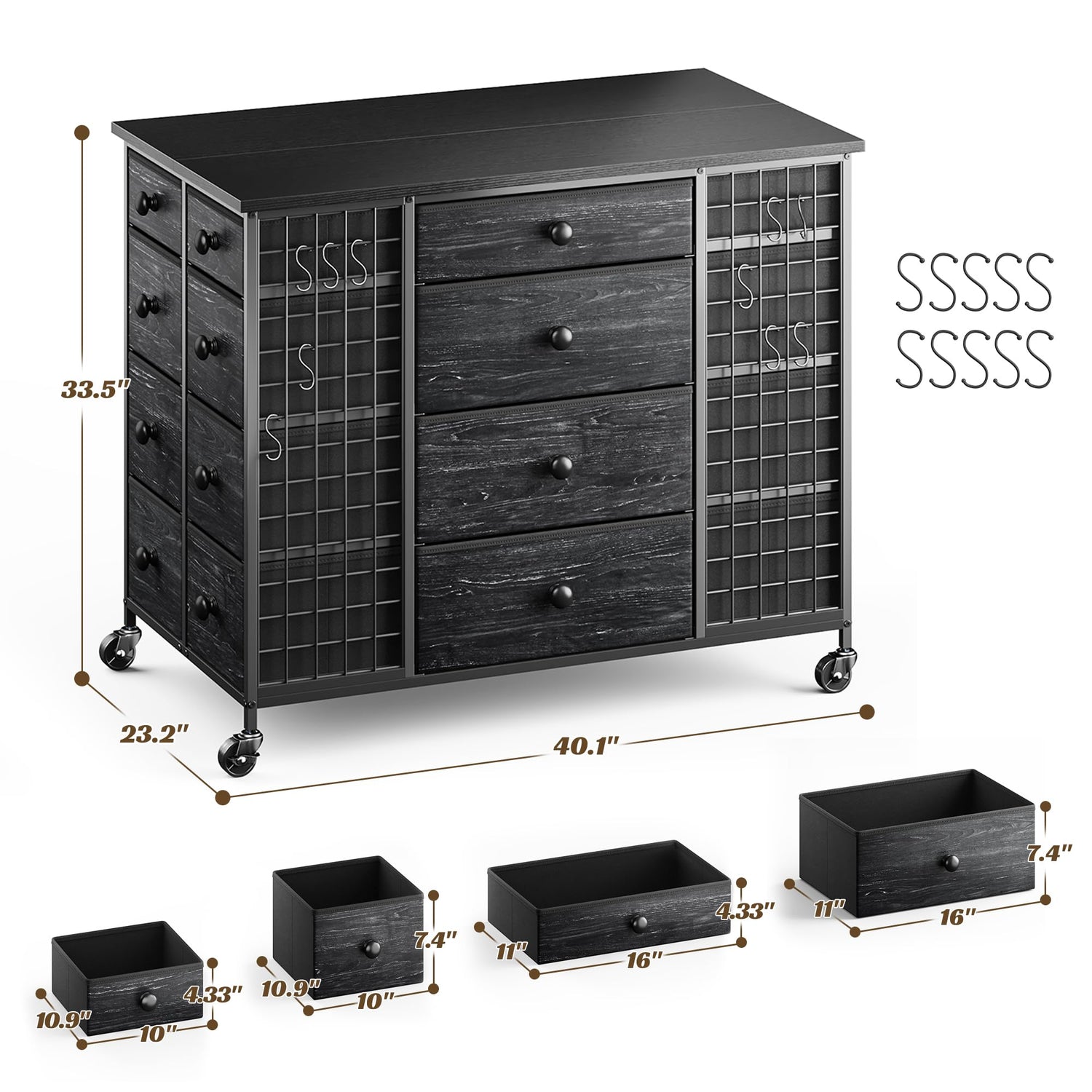 - 【Dresser with Smooth Rolling Lockable Wheels】Comes with 4 smooth rolling casters that provide easy mobility, allowing you to reposition the dresser as needed. The 2 wheels can be locked in place, ensuring stability during meal prep or organizing items. You decide when to move or stop. Additionally, 10 S-shaped hooks on the sides are perfect for hanging hats, umbrellas, and more