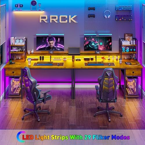 EnHomee 44 Inch Computer Desk with Hutch and Drawers,Reversible Home Office Desk with Monitor Shelf,Small Gaming Desks with USB Power Outlets,Writing Table for Office with LED Lights,Rustic Brown
