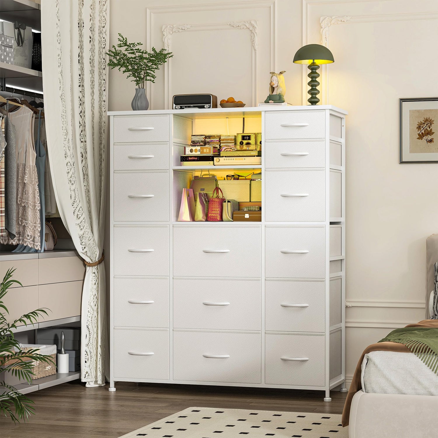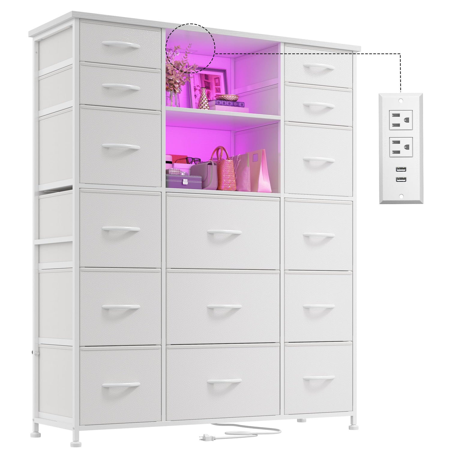 EnHomee 51" H White Dresser with 15 Drawers Dresser for Bedroom with Charging Station & LED Lights & Hutch Sturdy Bedroom Dressers, Steel Frame, Wood Top, 51.2" H x 39.3" W x 11.8" D