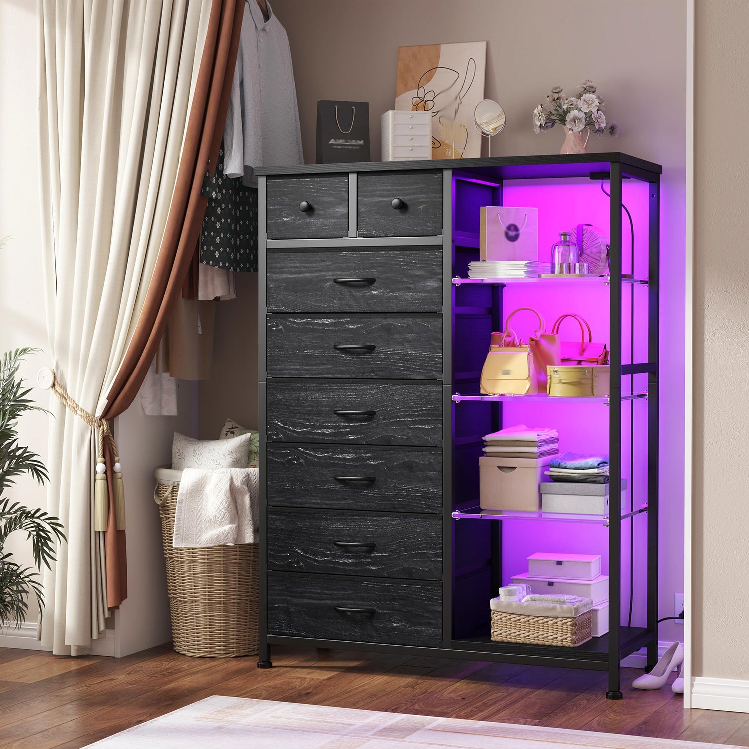 EnHomee 54" H Dresser for Bedroom with LED Lights & Power Outlets Dresser with 8 Drawers Fabric Dressers & Chests of Drawers for Bedroom, Sturdy Metal Frame, Acrylic Plates (Charcoal Black)