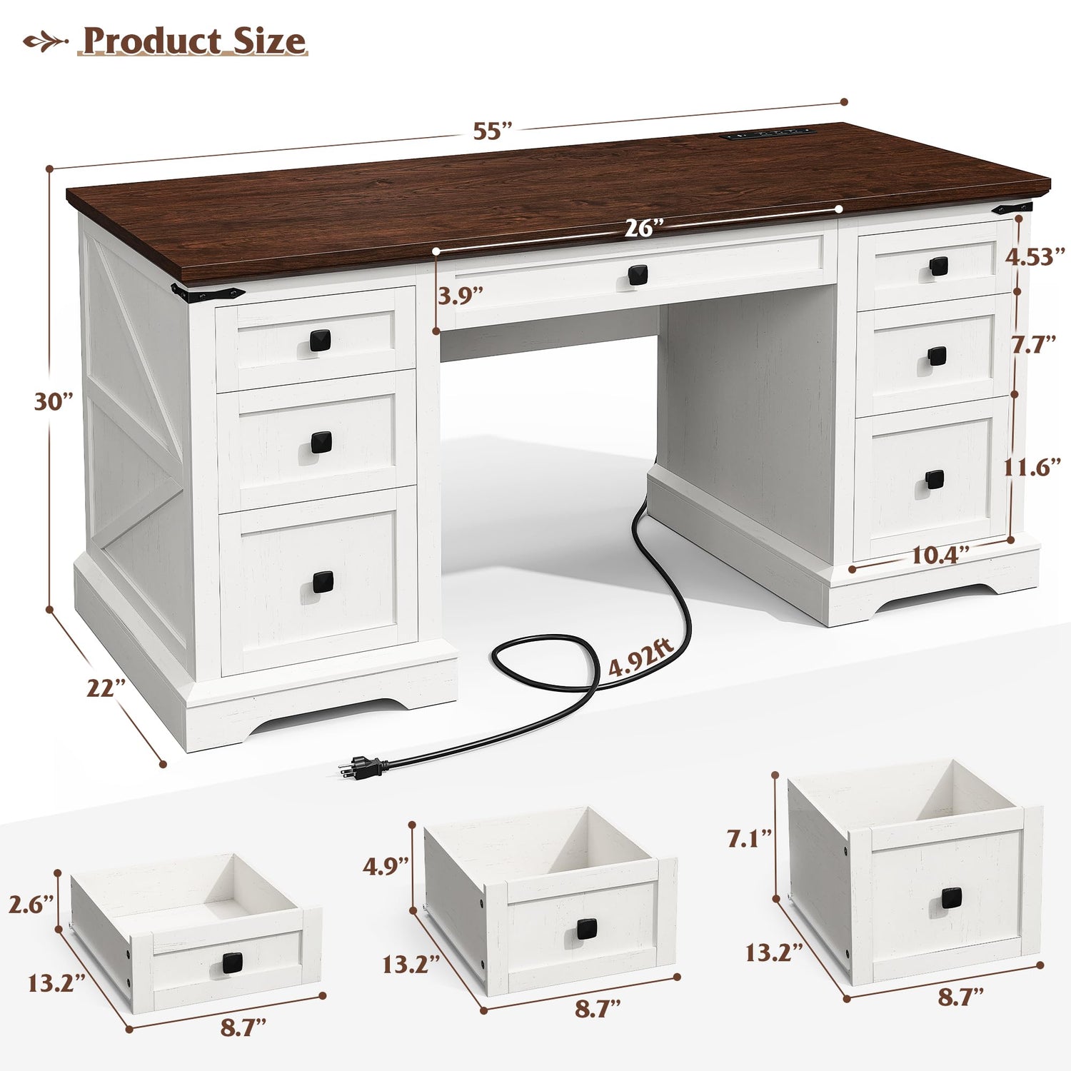 EnHomee 55" Computer Desk with 7 Drawers Farmhouse Computer Desk with Charging Station Home Office Desk for Study, Bedroom, Living Room, Office Desk,Desk,Brown+White,Dark Rustic Oak