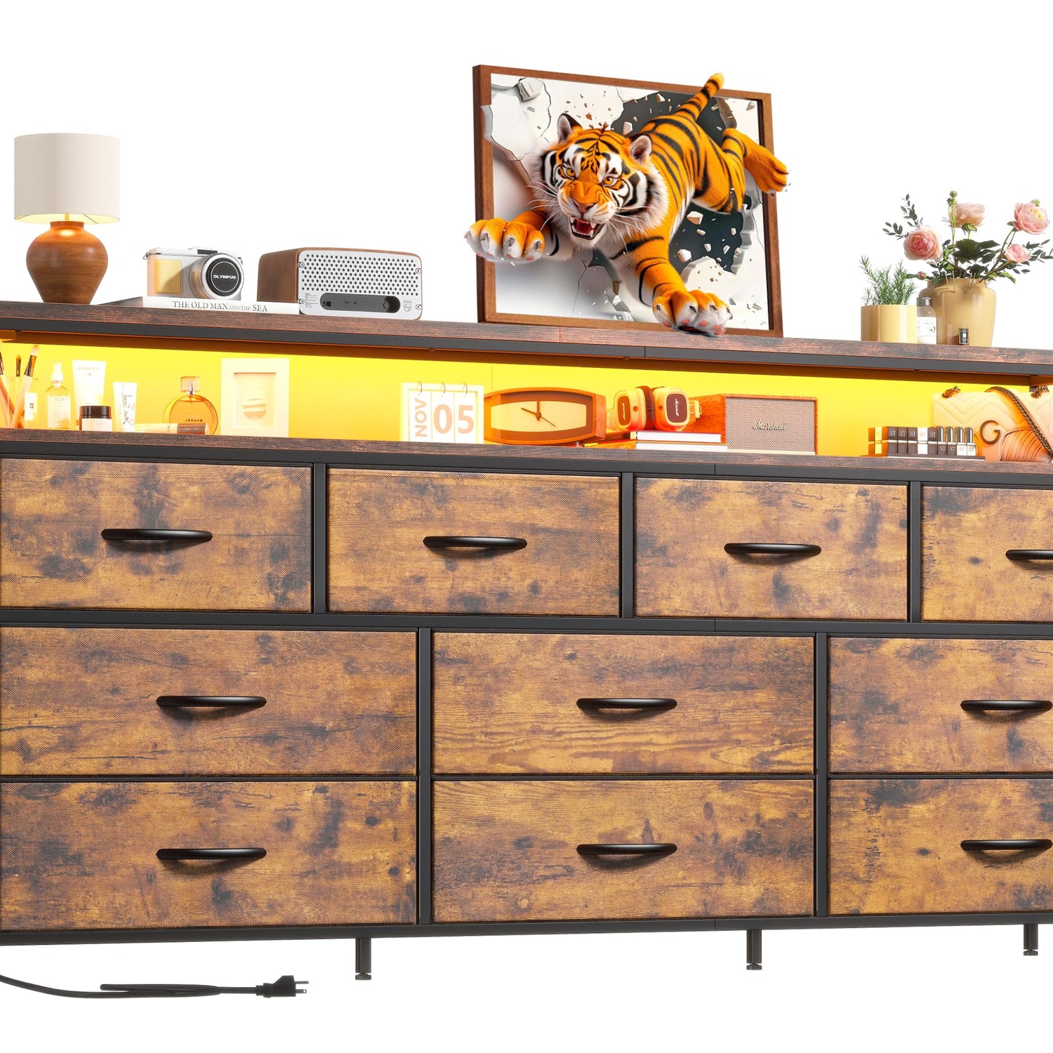 EnHomee 55" W Dresser for Bedroom with 10 Drawers Long Dresser with LED Lights & Power Outlets Wide Dressers & Chests of Drawers Large Dresser for Bedroom Dresser Metal Frame, Wood Top, Rustic Brown