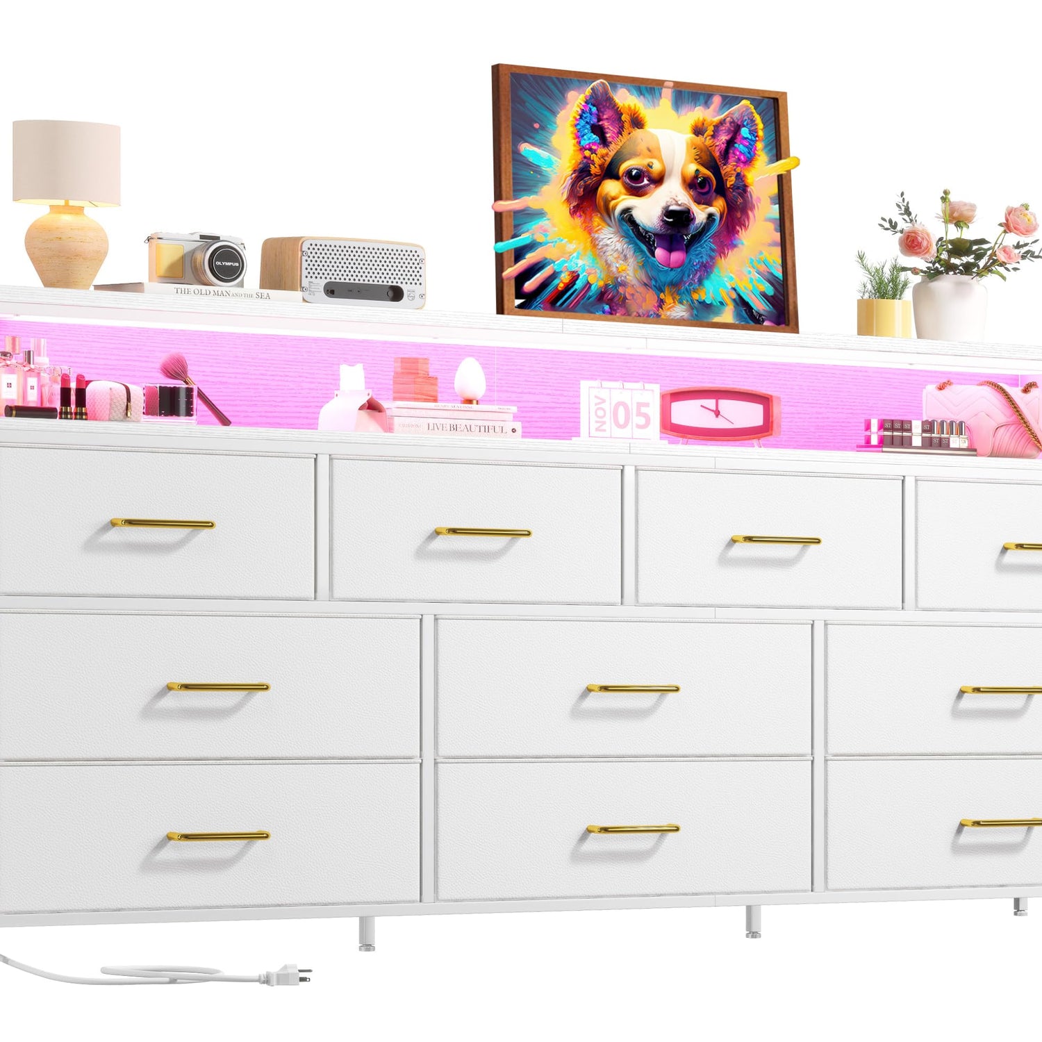 EnHomee 55" W White Dresser for Bedroom with 10 Drawers Long Dressers & Chests of Drawers with LED Lights & Power Outlets Large Dresser for Bedroom Dresser for Closet, Hallway, Metal Frame, White