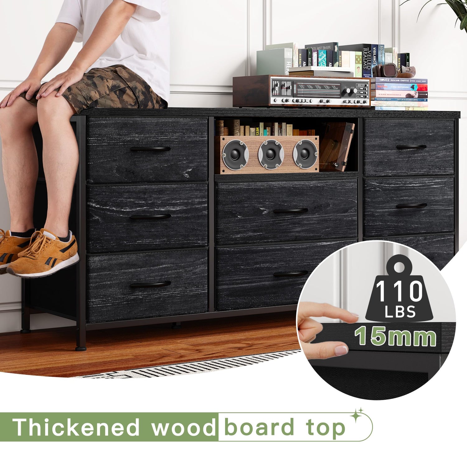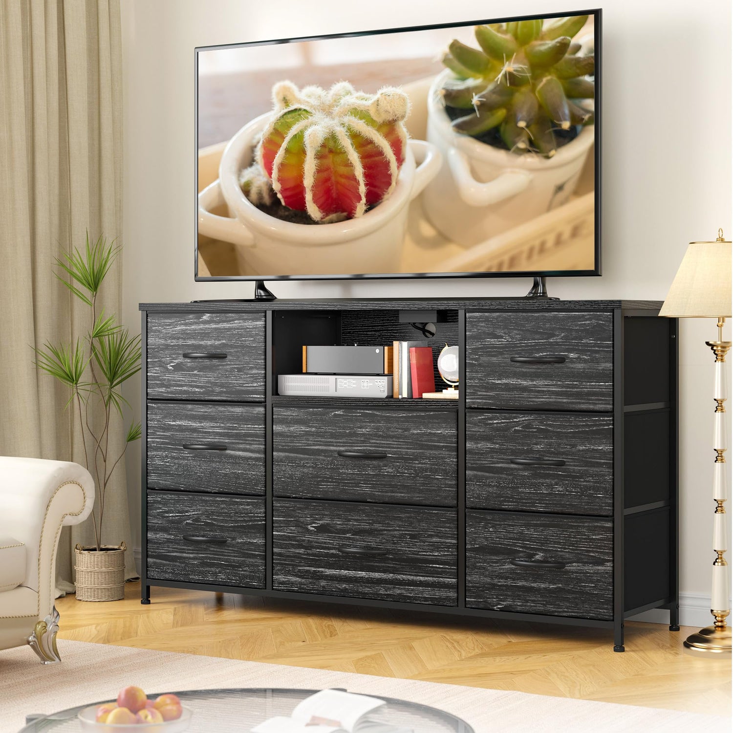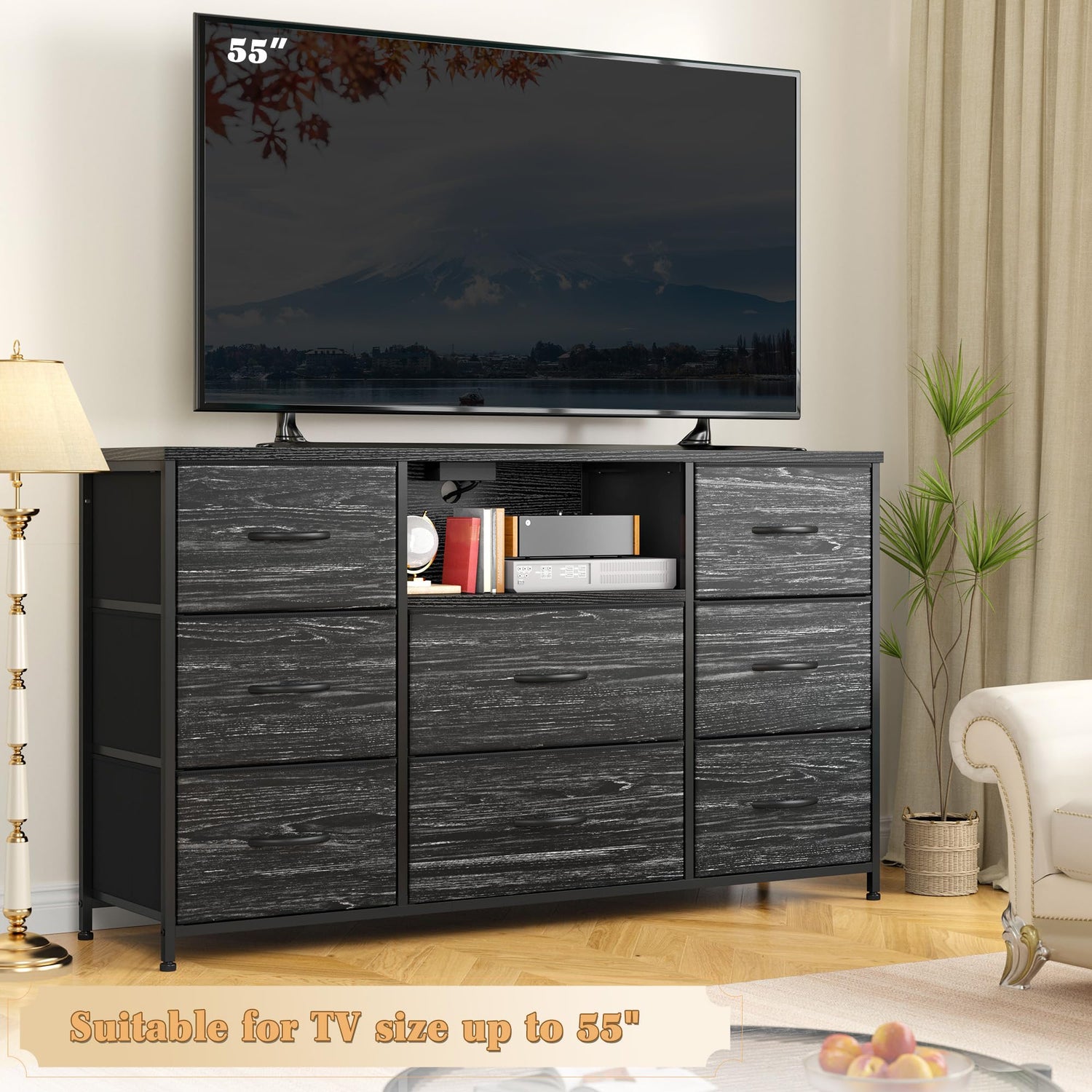 EnHomee Black Dresser for Bedroom with Charging Station, 8 Drawers Dressers & 55 inch TV Stand for Bedroom, Fabric Chest of Drawers with Open Shelves, Sturdy Dresser for Closet Living Room, Hallway