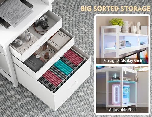 EnHomee Computer Desk with Drawers 66" Reversible Gaming Computer Desk with LED Light & Power Outlets White L Shaped Gaming Desk with Monitor Stand & Shelves Home Office Desks for Gaming Room