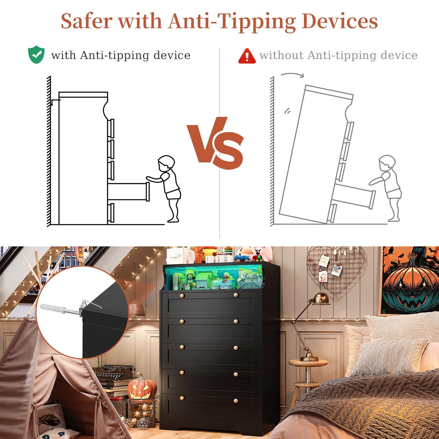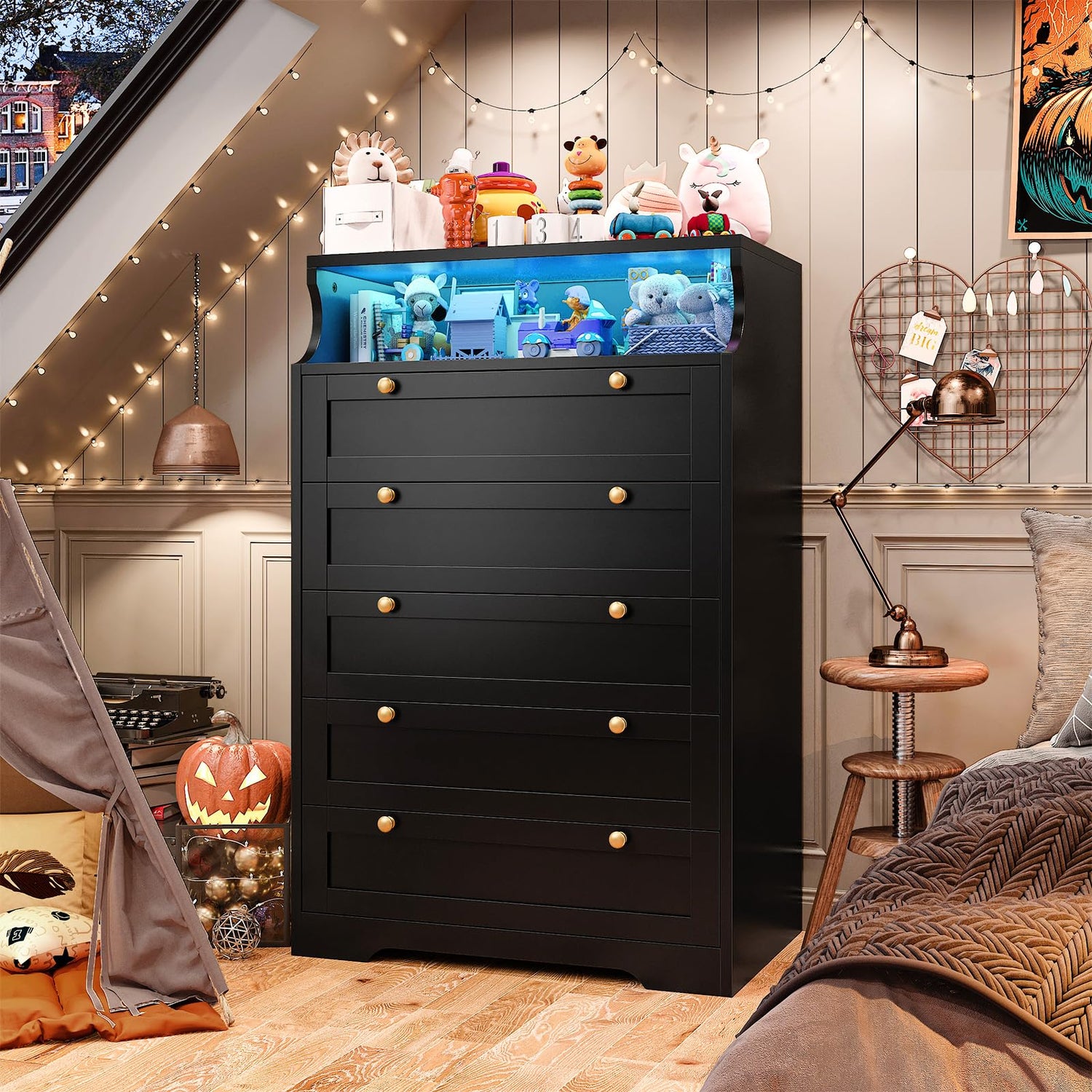 EnHomee Dresser, Black Dresser with LED, Bedroom Dressers & Chests of Drawers, Tall Dresser with 5 Wood Drawers, Black Dresser for Bedroom, 5 Drawer Dresser, Tall Dressers for Bedroom