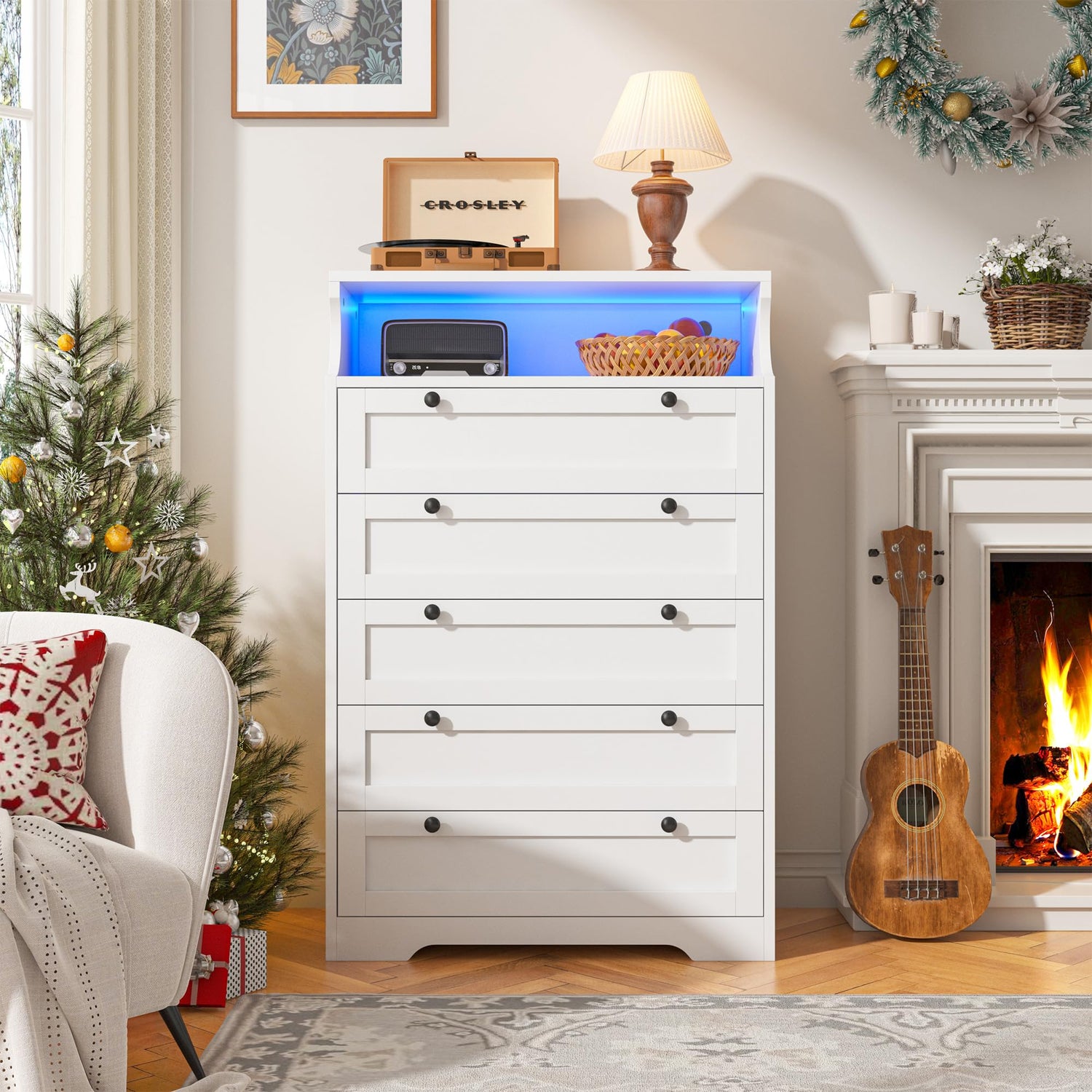 EnHomee Dresser for Bedroom, Modern White Dresser with LED Light, Tall Dresser with 5 Large Wood Drawers for Closet Organizers and Storage Clothes, Chests of Drawers for Closet, Entryway