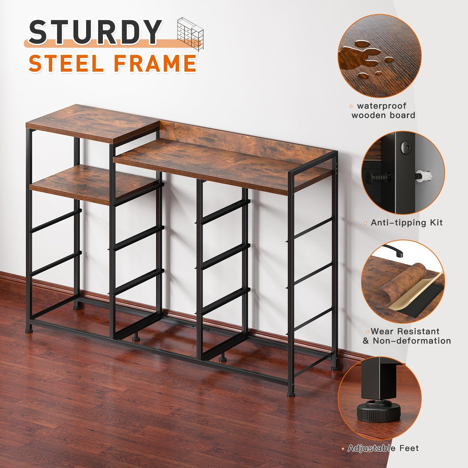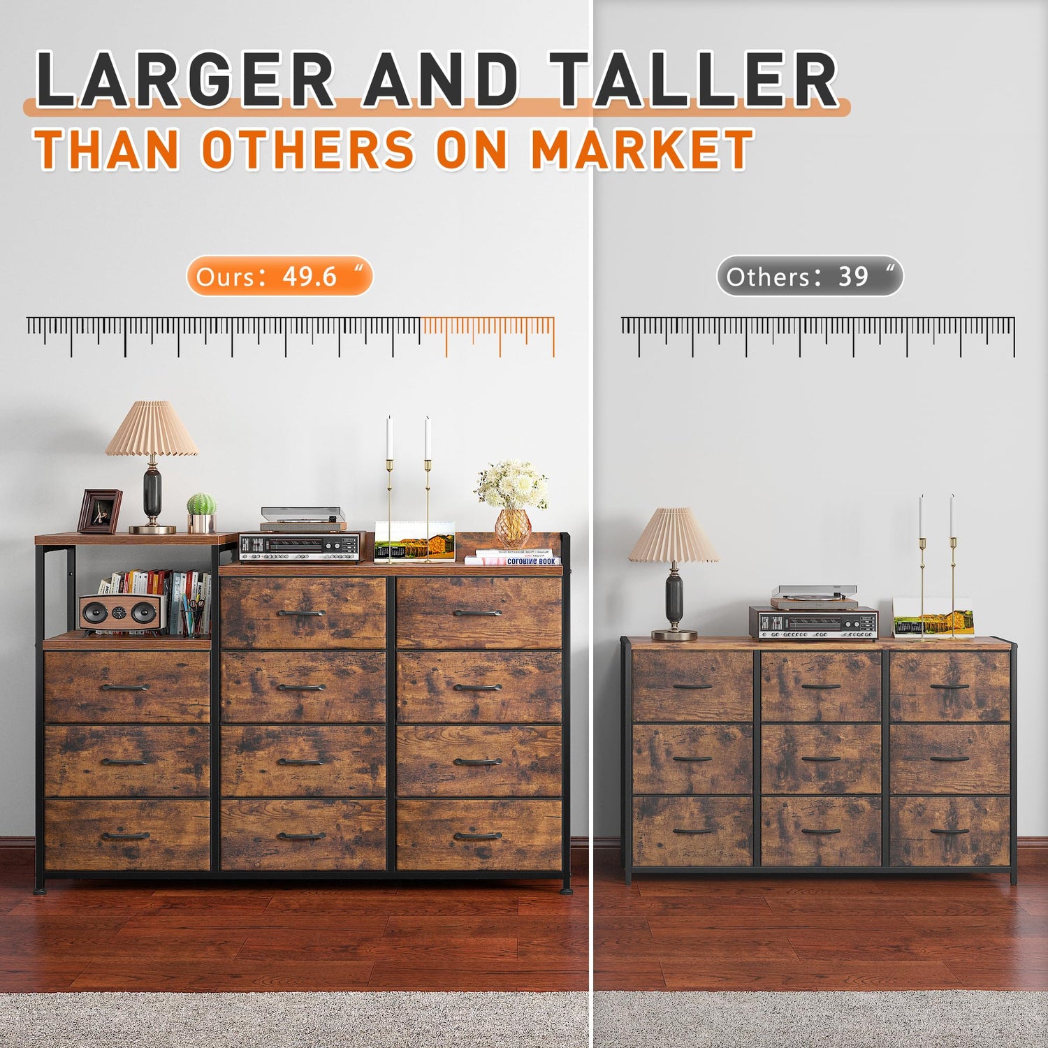 - 11 Drawer Dresser for Bedroom: The size of long dresser is 50" W X 11.4" D X 40" H with 2-tier open shelves. This rustic brown dresser not only takes up less space, but also provides ample storage space to store clothes, pants, books and other odds and ends. The wood tops can hold lamps, vase, the open shelf provides additional space to place electronics, photos, and frequently used items. This TV stand dresser keeps your room clean and tidy all the time.