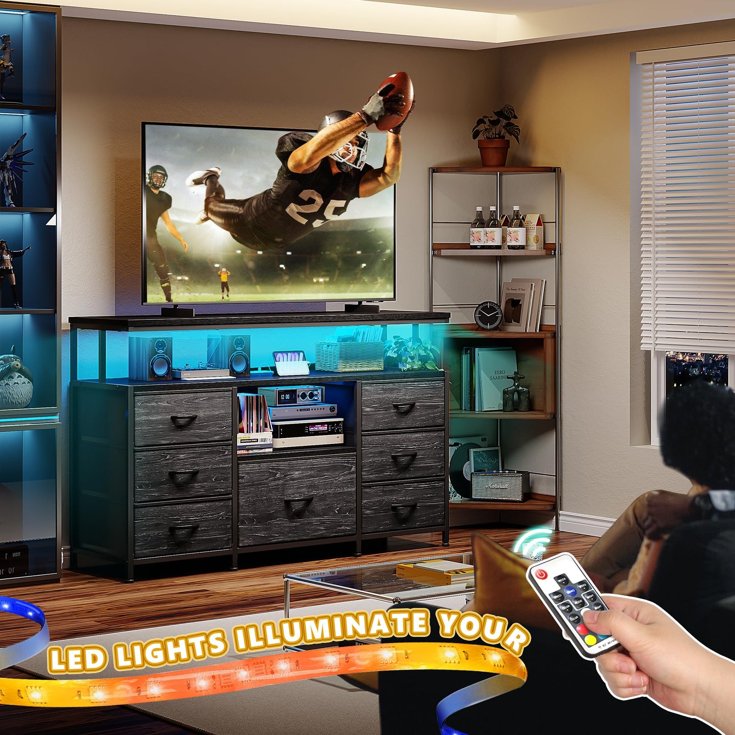 EnHomee Dresser TV Stand for Bedroom with LED Lights & power outlets for 55" TV Stand Dresser for Bedroom Entertainment Center with 7 Fabric Drawers and Wood Shelves for Living Room, Black