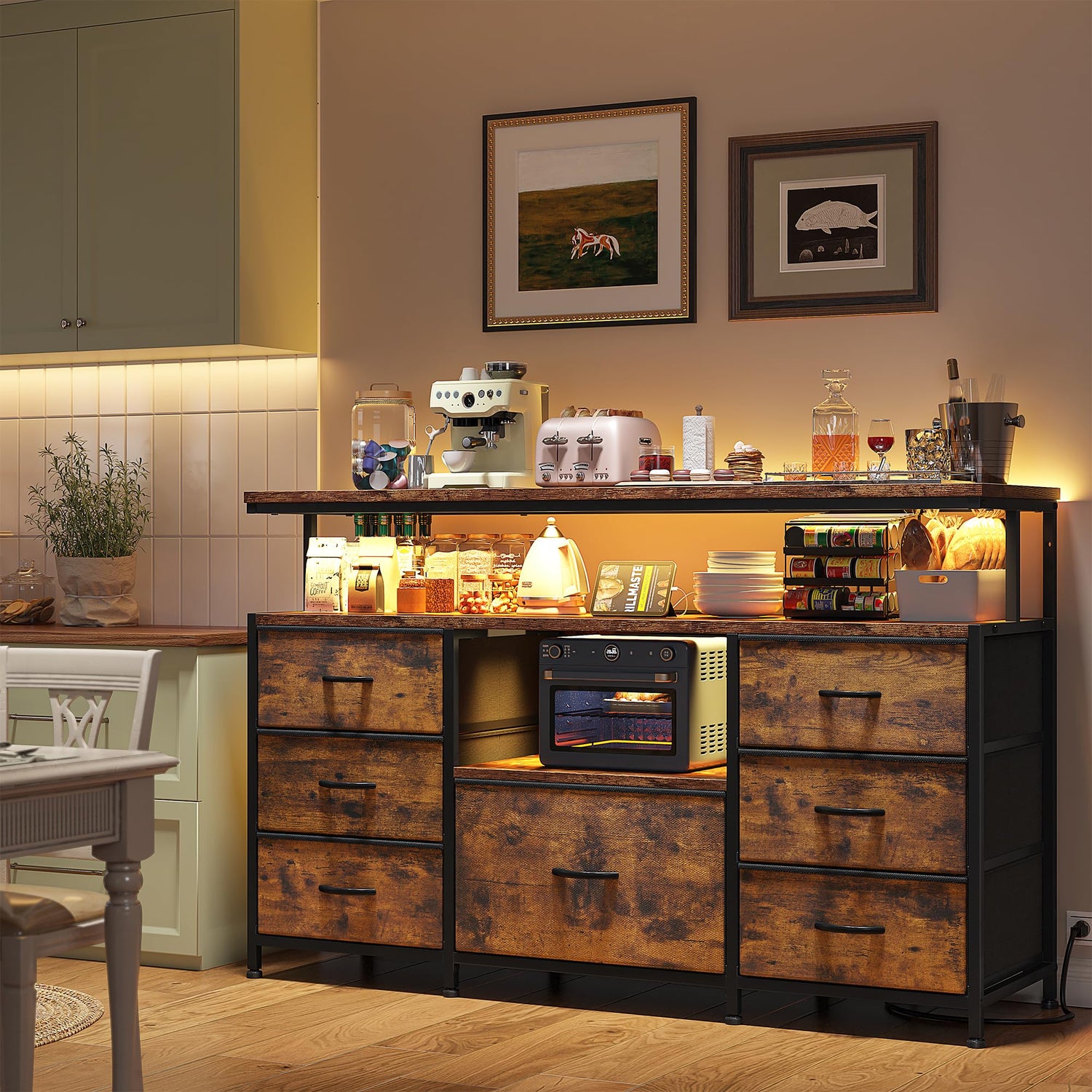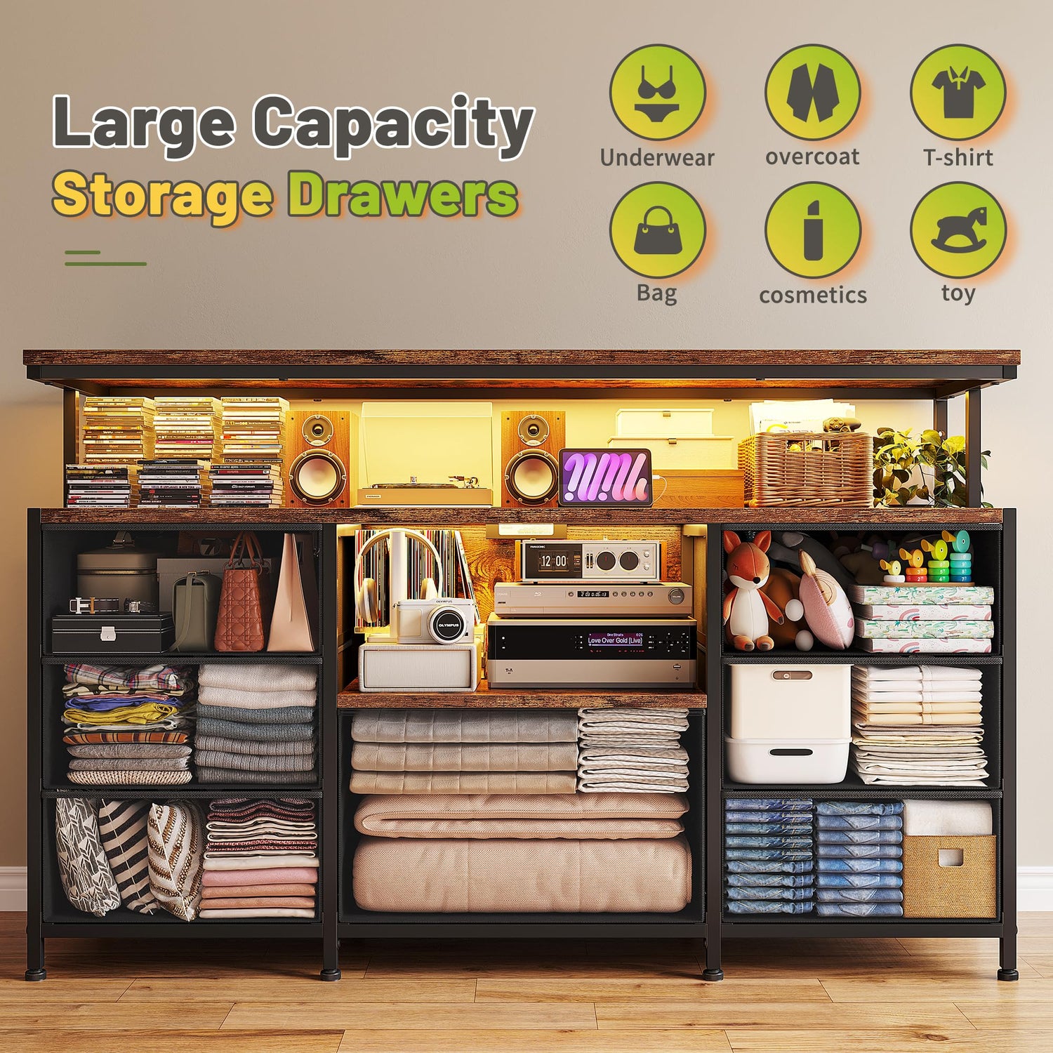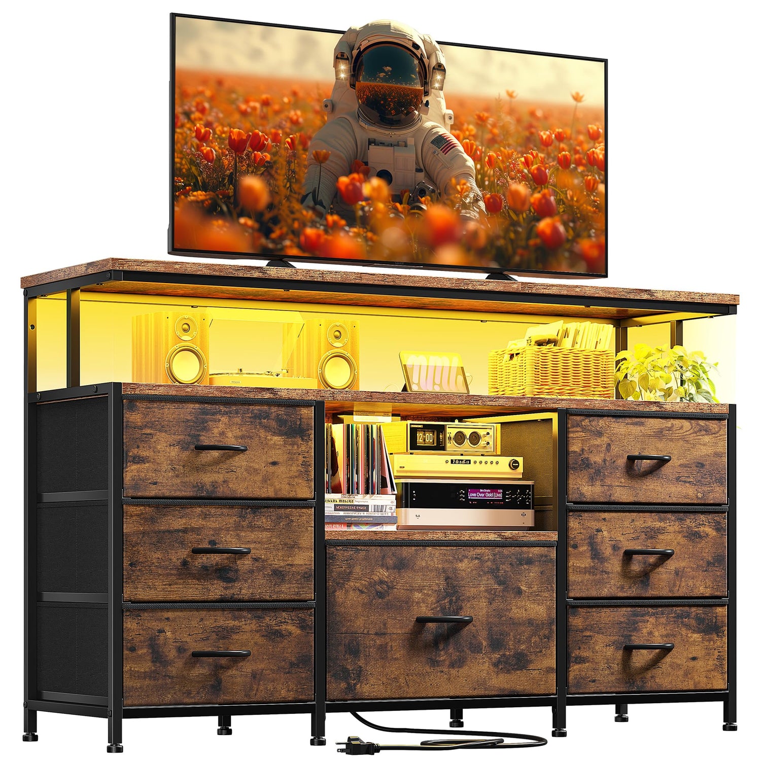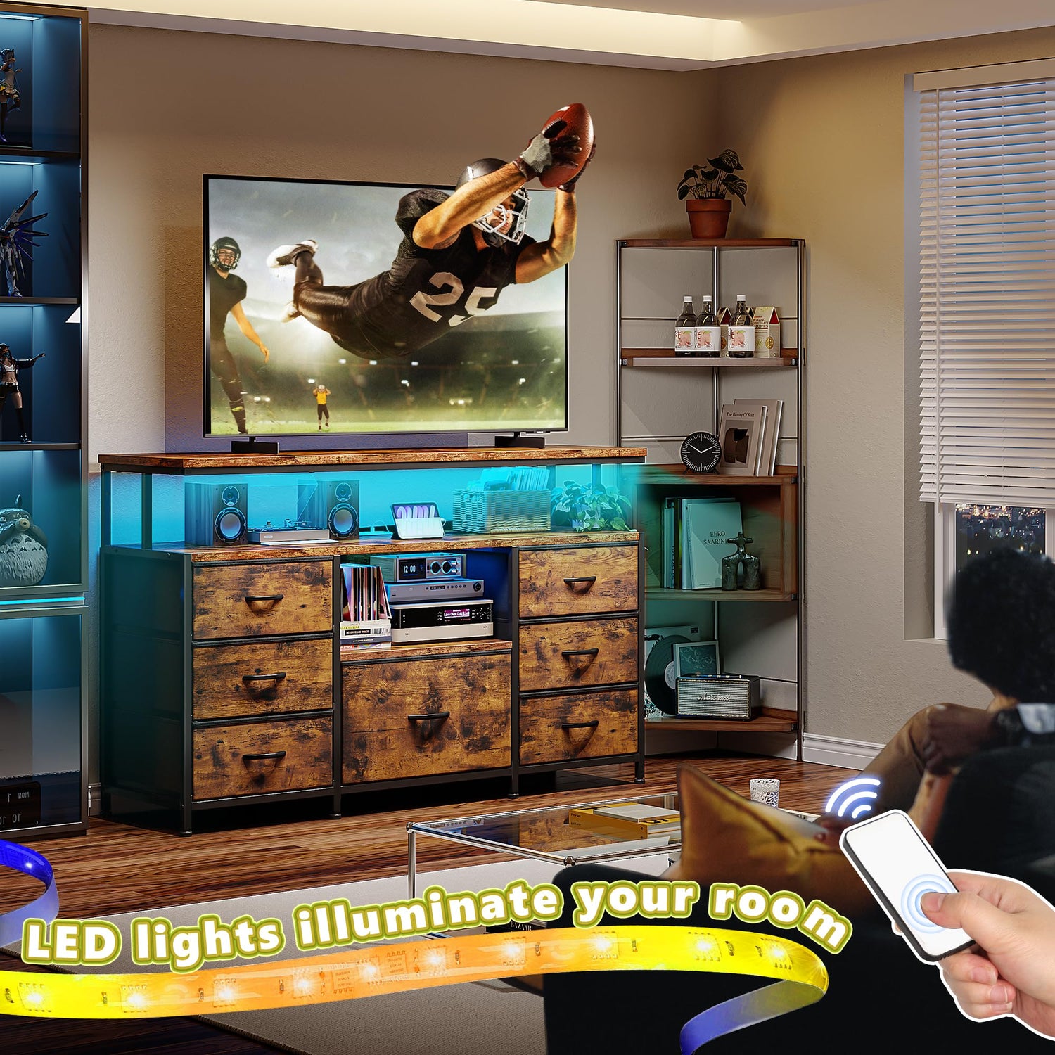 EnHomee Dresser TV Stand for Bedroom with LED Lights & power outlets for 55" TV Stand Dresser for Bedroom Entertainment Center with 7 Fabric Drawers and Wood Shelves for Living Room, Rustic Brown