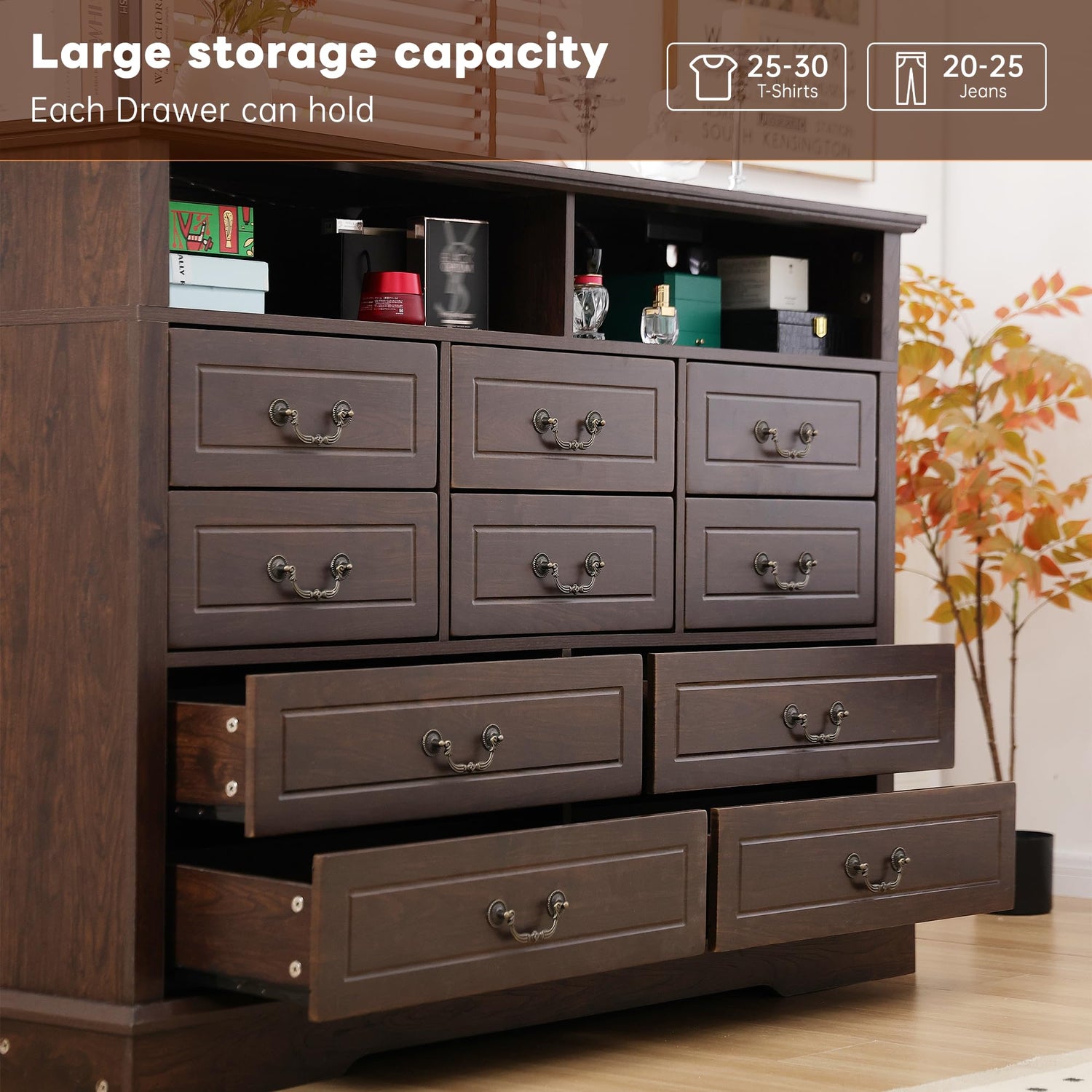 EnHomee Farmhouse Dresser for Bedroom 55.2''Wide Wood Dresser with LED & Power Outlet Vintage 10 Drawers Dressers & Chests of Drawers Long Dresser TV Stand, Closet, Entryway, Rustic Brown