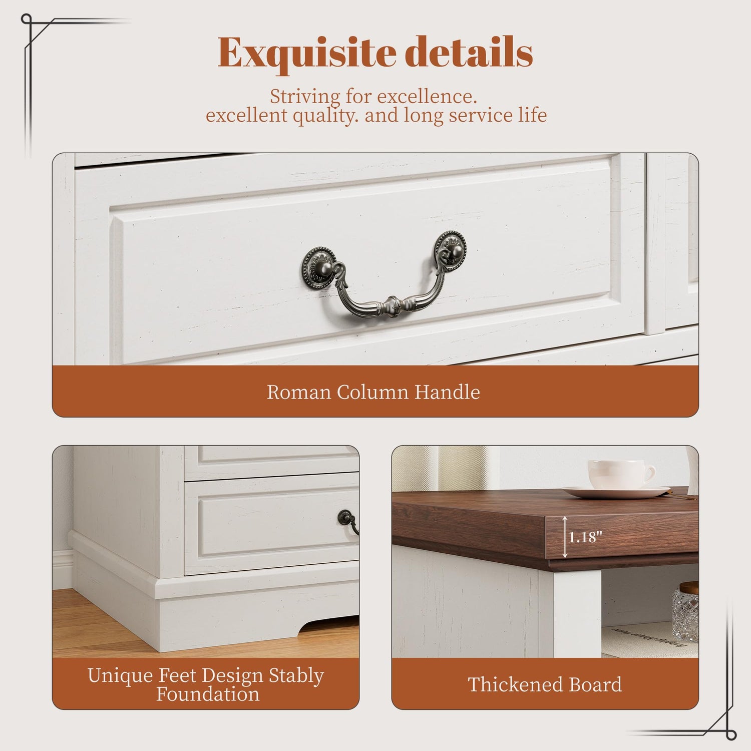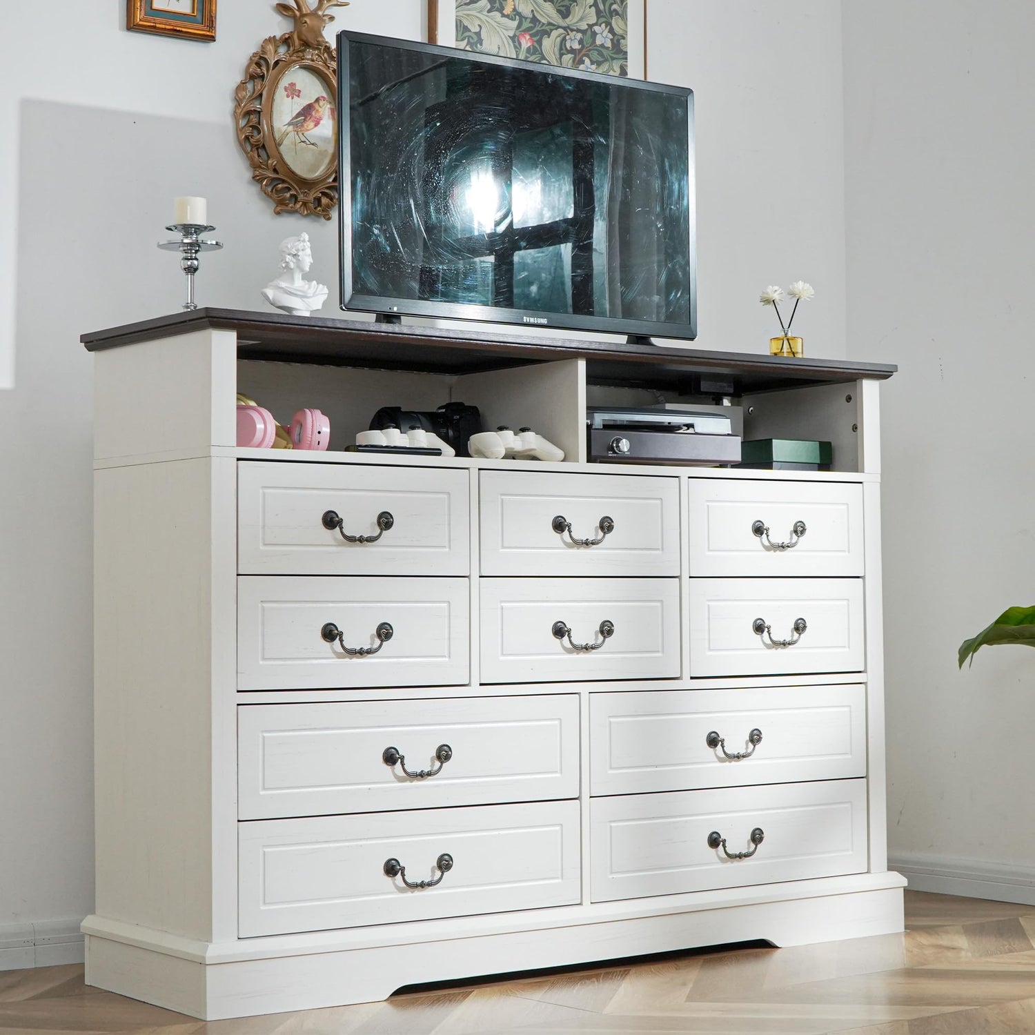 EnHomee Farmhouse Dresser with LED & Power Outlet 55.2''W Wood Dresser for Bedroom White 10 Drawers Dresser Vintage Dressers & Chests of Drawers Dresser TV Stand, Hallway, Antique White
