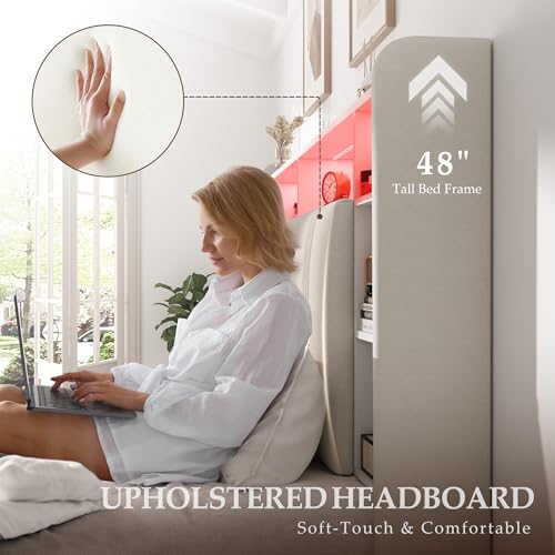 EnHomee King Size Bed Frame with 4 Storage Drawers, Upholstered Platform King Bed Frame with Headboard & LED Lights & Charging Station, Noise Free, No Box Spring Needed, Beige