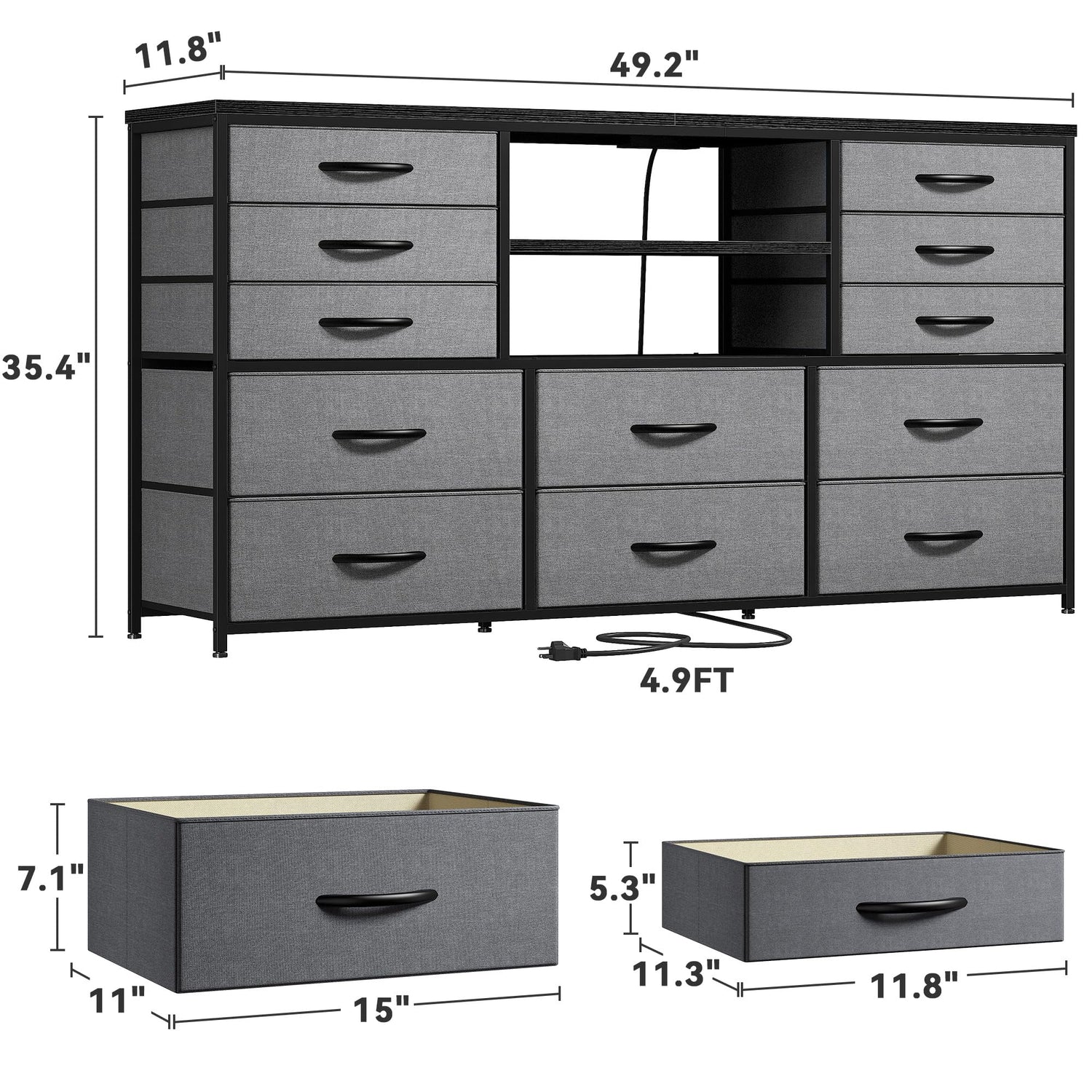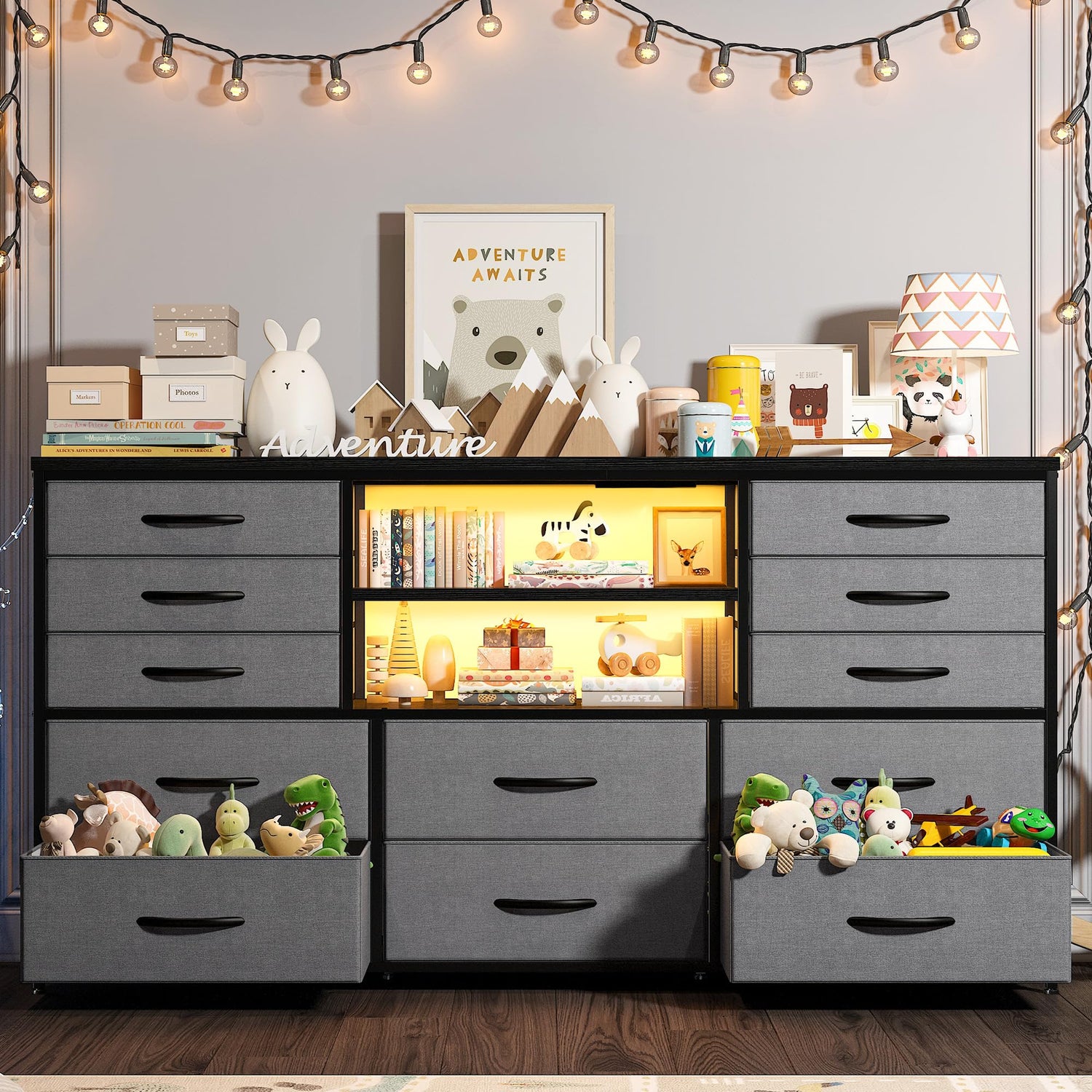 EnHomee Long Dresser for Bedroom with 12 Fabric Drawers,Bedroom Dresser with LED Lights & Power Outlet, Wooden Top & Metal Frame,for Nursery, Living Room, Closet, Grey, 49.2''W*11.8''D*35.4''H