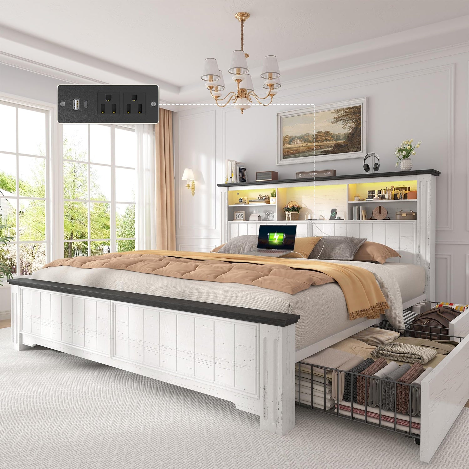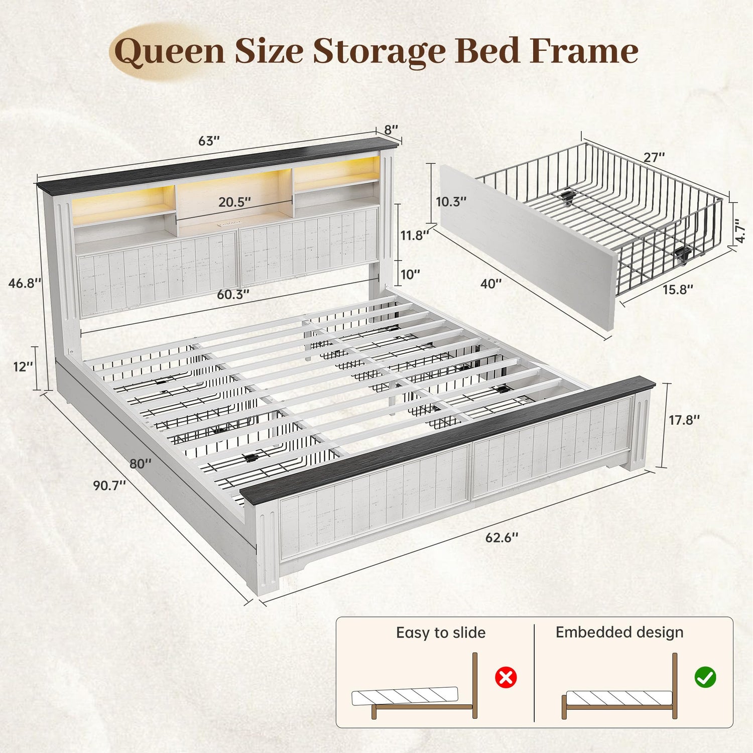 EnHomee Queen Bed Frame with Headboard, Bed Frame Queen Size with 4 Drawers Charging Port & LED, Farmhouse Queen Bed Built in Charging Station,No Box Spring Needed,NO Noise,White with Grain Marks