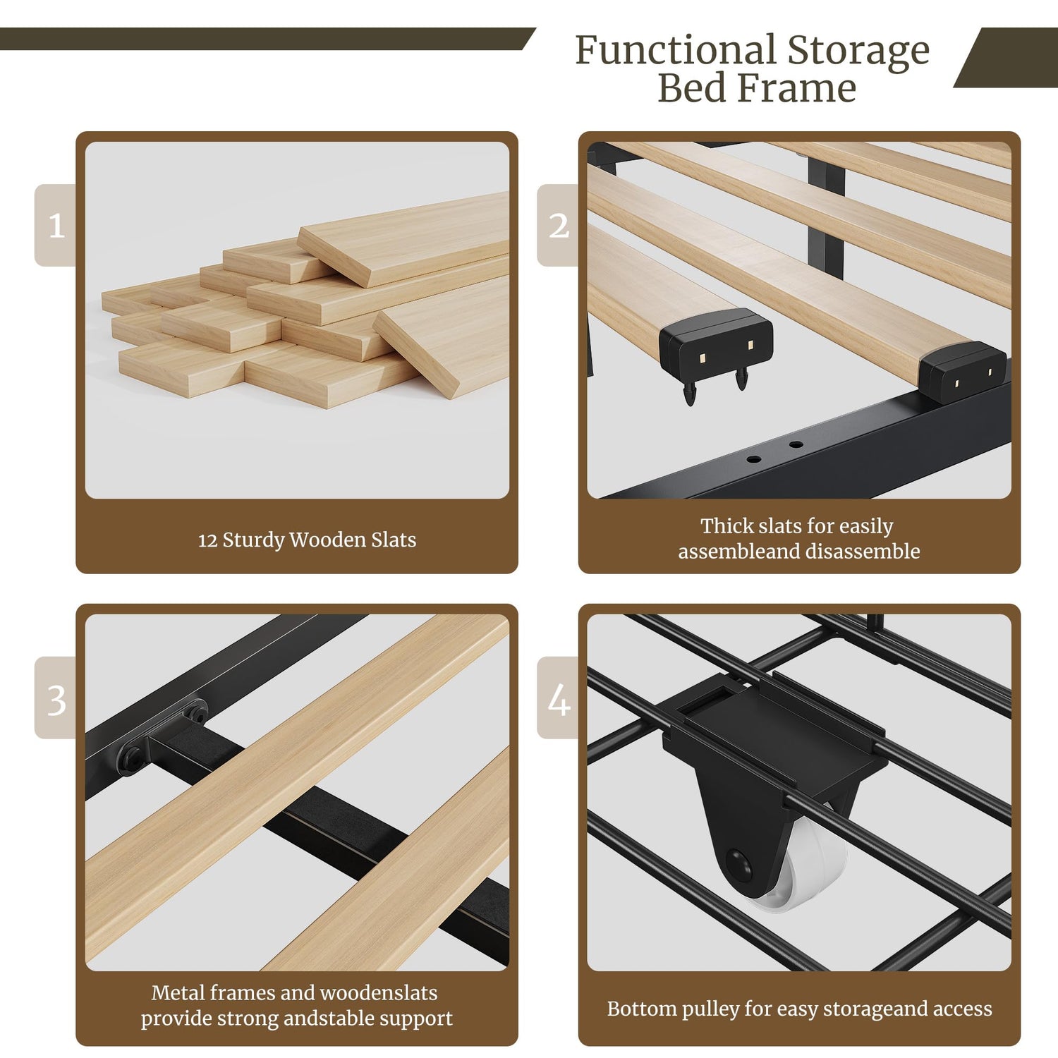 Storage is always a concern in any bedroom, but the EnHomee bed frame is ingeniously designed with three spacious drawers located at the front and sides. These drawers can accommodate up to 50 T-shirts, 45 pairs of pants, and 15 blankets, providing ample room for sheets, pillows, and other essentials. With four wheels on each drawer, accessing your stored items is effortless, gliding smoothly over semi-thick carpets, while the integrated closing clasp ensures everything stays securely in place.