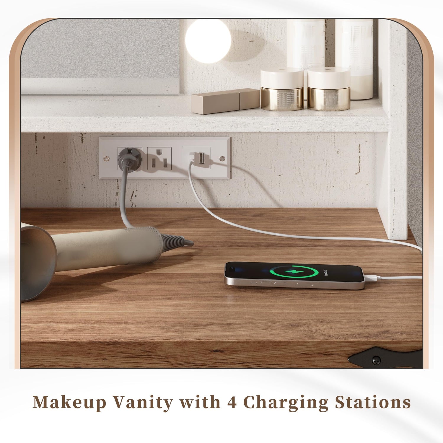 - 【Built-in Charging】This Corner vanity desk with mirror and lights has a built-in power strip, which is super convenient for you to charge your hairdryer, curling iron, phone, or tablet while you do your makeup.
