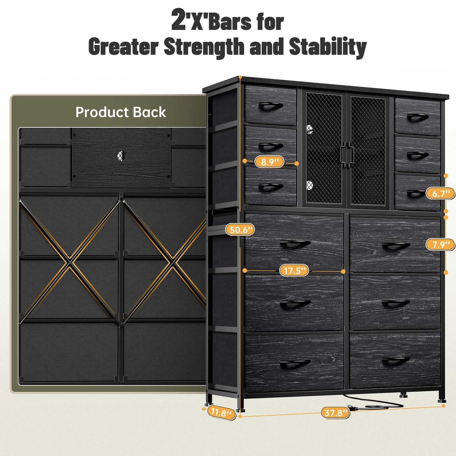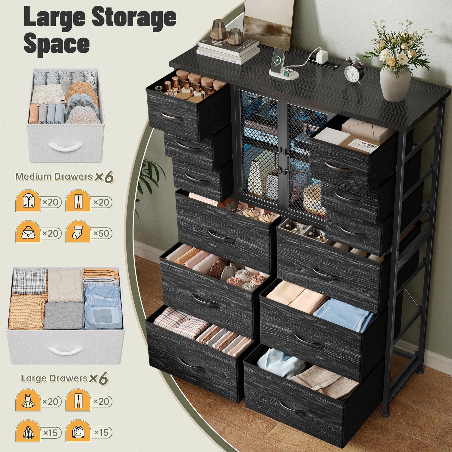 EnHomee Tall Dresser for Bedroom with 12 Drawer Dressers & Chests of Drawers for Closet with Charging Station & LED Lights & Mesh Door Sturdy Black Dresser with Wooden Top and Metal Frame