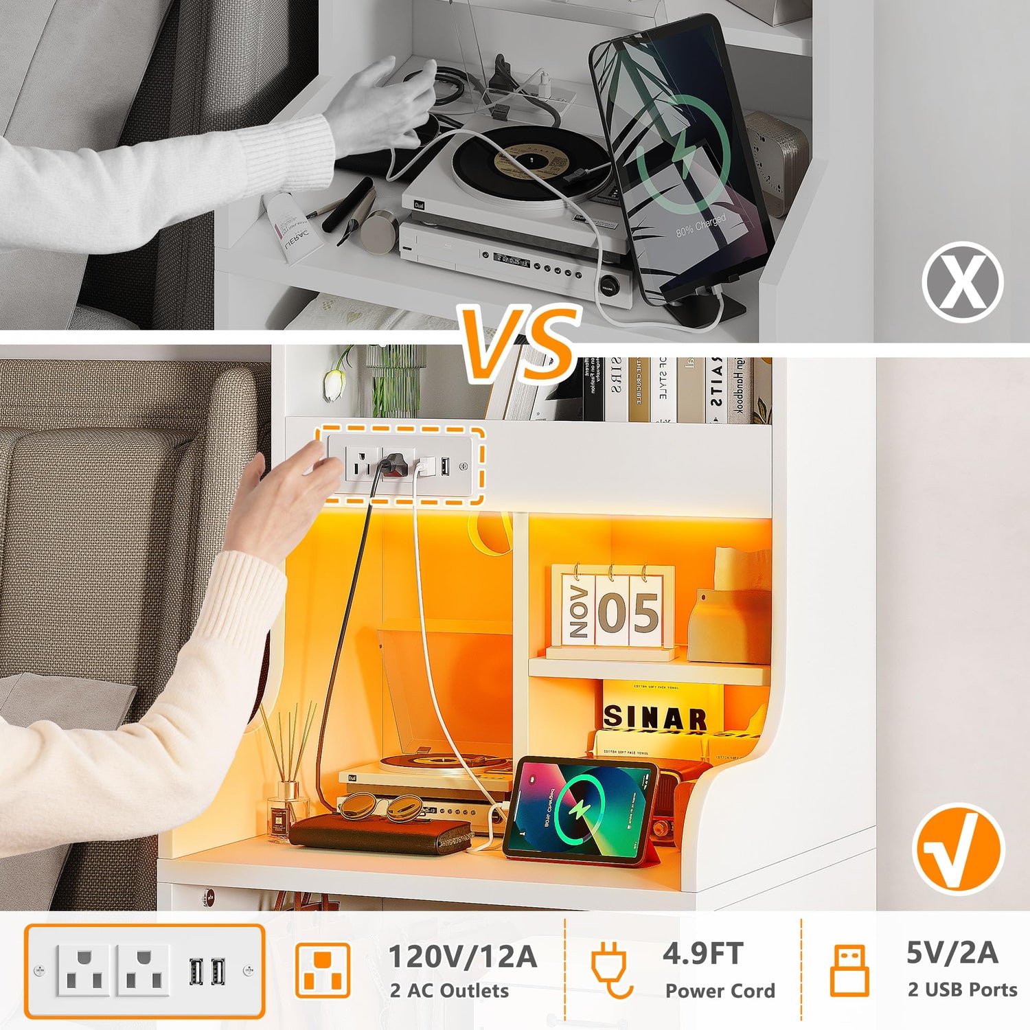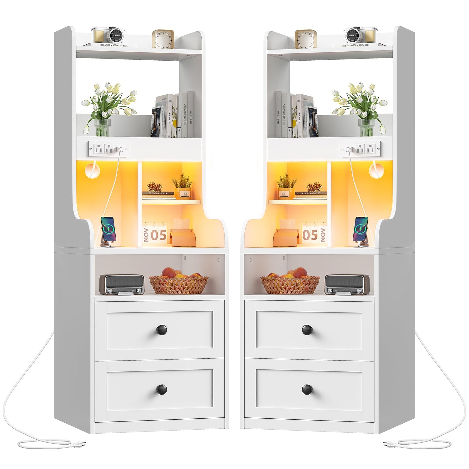 EnHomee Tall LED Nightstands Set of 2 with Charging Station and 2 Drawers in White