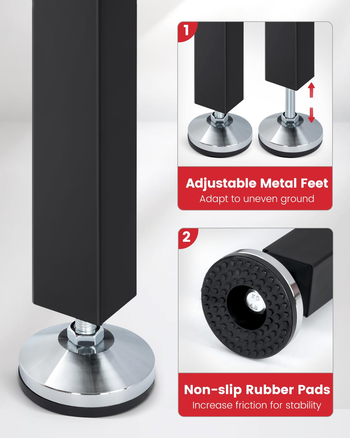 - Adjustable metal feet, adapt to uneven ground to maintain stability. Anti-slip silent rubber pads increase friction for stable and safe.