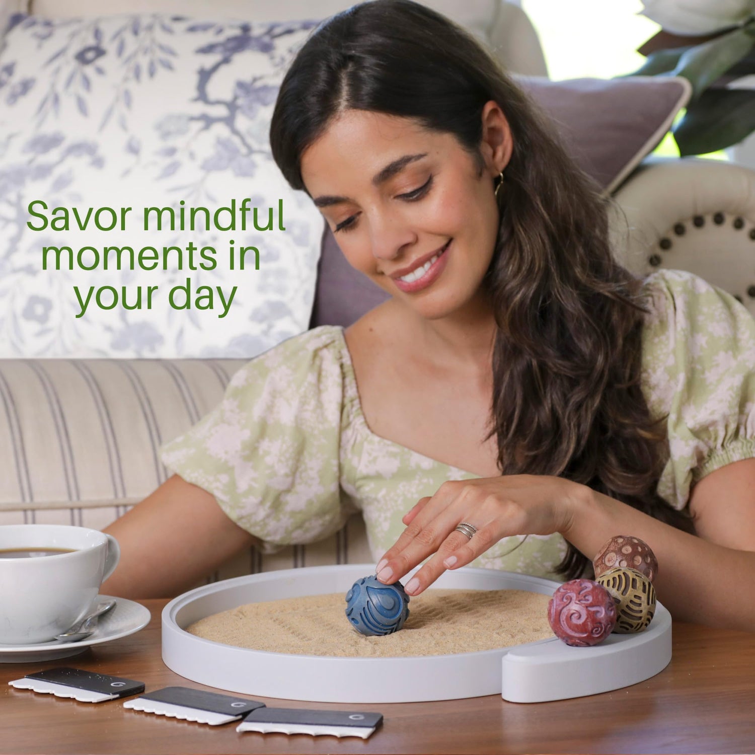 - SOOTHE YOUR MIND The simple act of rolling the Zen spheres in the sand delivers a truly calming experience. Use it for meditation or stress relief and add some peace and mindfulness to your day. Discover the meaning behind each sphere in your zen garden kit: Earth, Breath of Wind, Still Water, and Voice