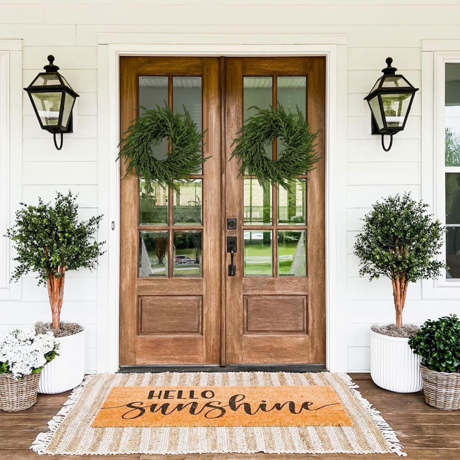 - Naturally Beautiful: Use the faux greenery Christmas wreath for mantle/table/doors/chandeliers/walls/corners/cabinets/farmhouse/fireplaces/windows/porch/outdoors, designed in Norfolk pine style with realistic appearance for your home to add festive mood
