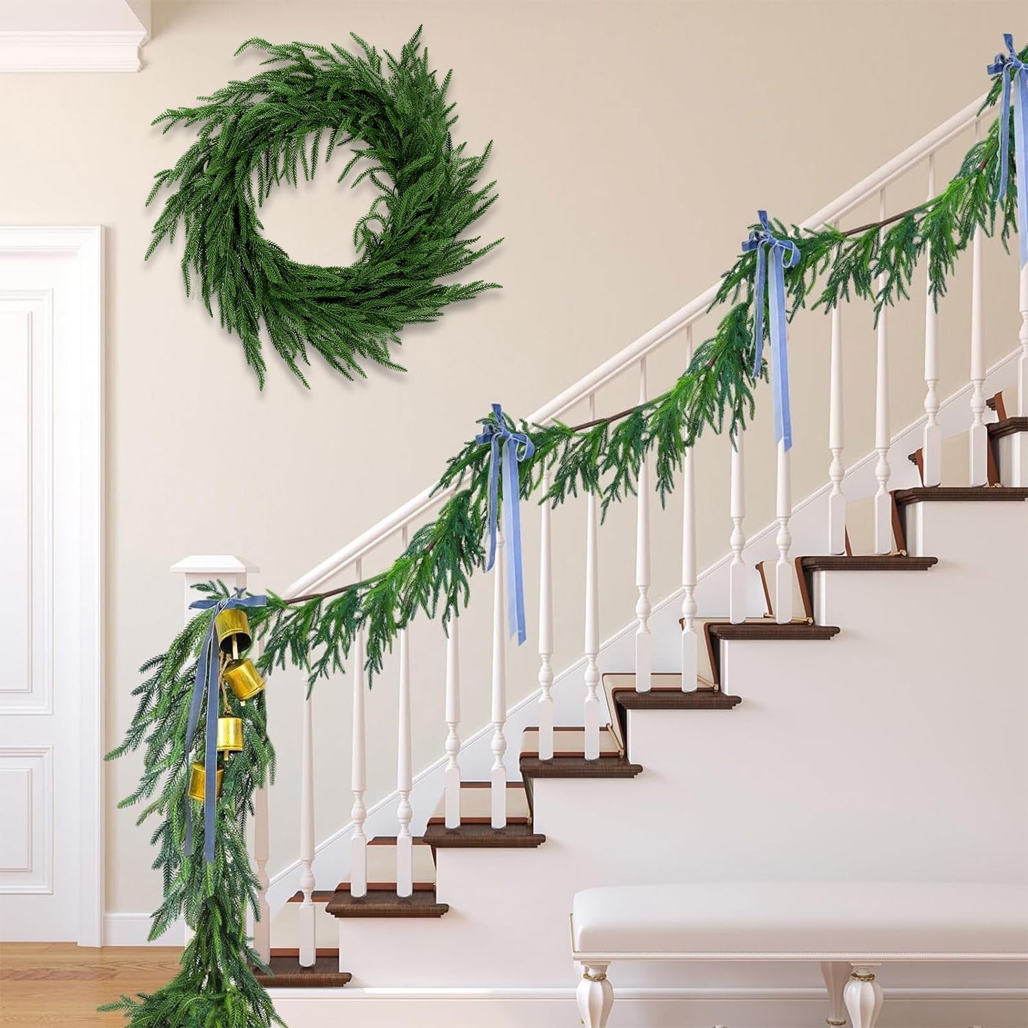 - Inspired by Nature: Featuring lush, lifelike greenery, this faux greenery Christmas garland and wreath. They showcase the true to life look and feel of freshly cut pine branches, creating a captivating ambiance throughout your space