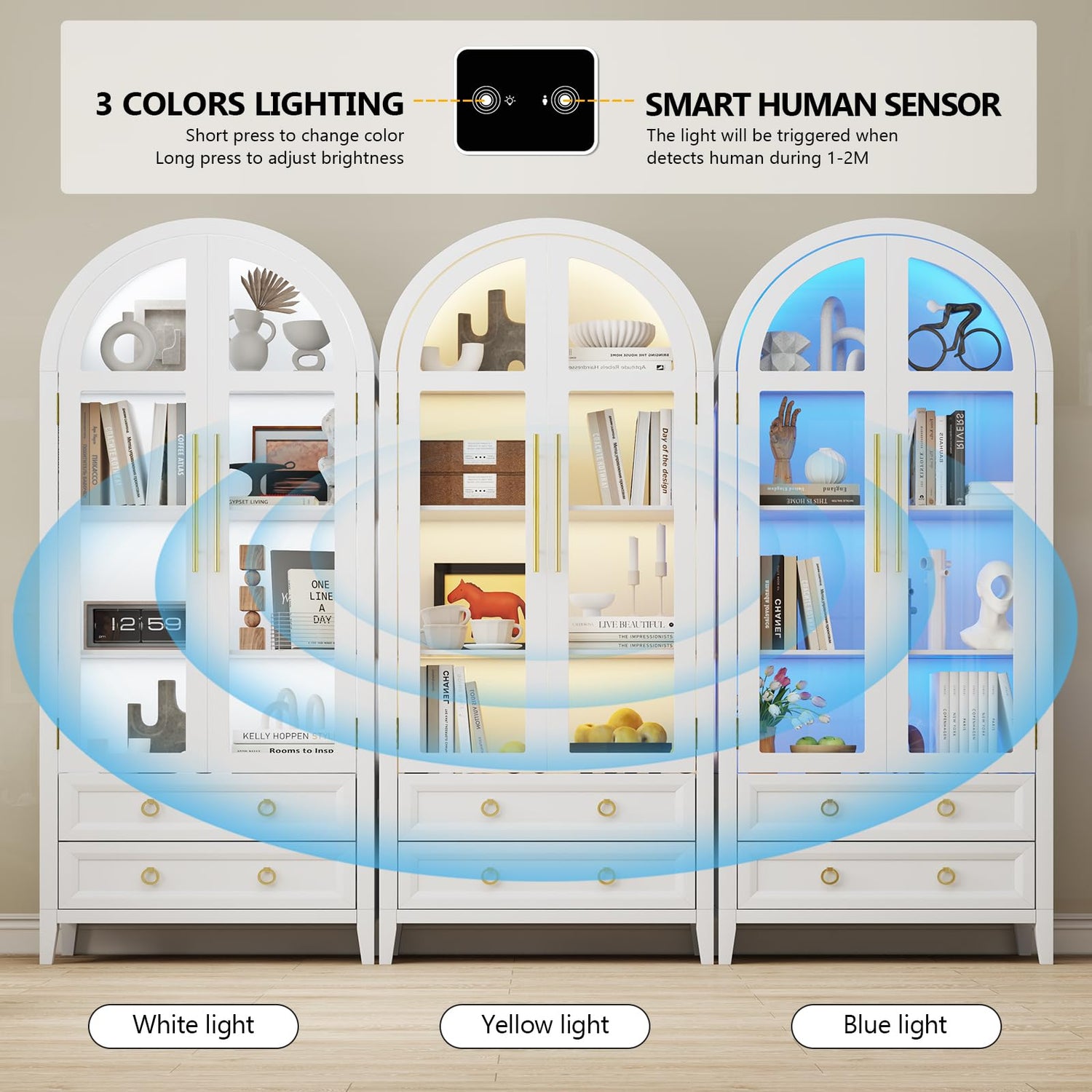 EOAWE Arched Curio Cabinet with Glass Doors, 4-Tier Display Cabinet with 2 Drawers, Tall Bookcase with 3 Color Lights, Display Case, Kitchen Pantry (White)