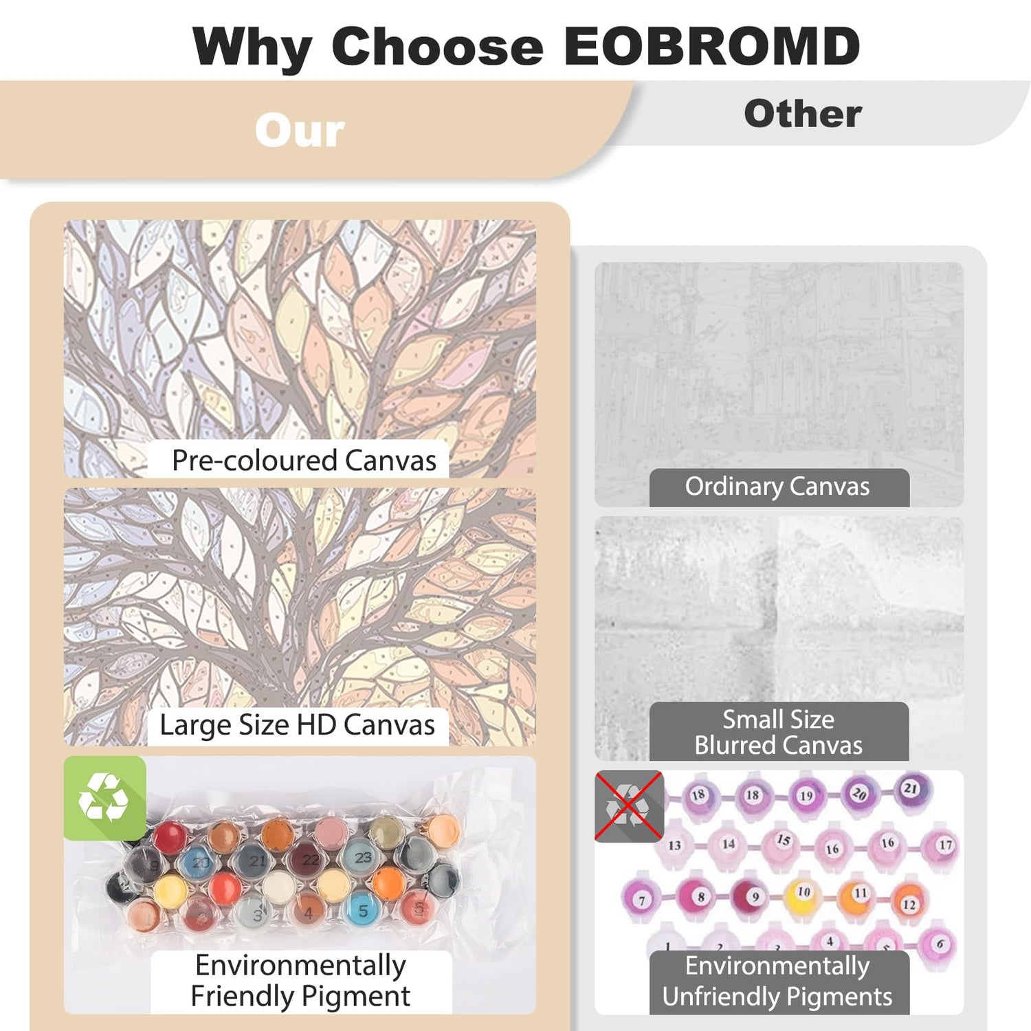 - High-quality Materials: EOBROMD use eco-friendly acrylic paints that are safe for all users. The linen canvas features HD printing for crisp, easy-to-read numbers, making your painting experience smoother and more enjoyable