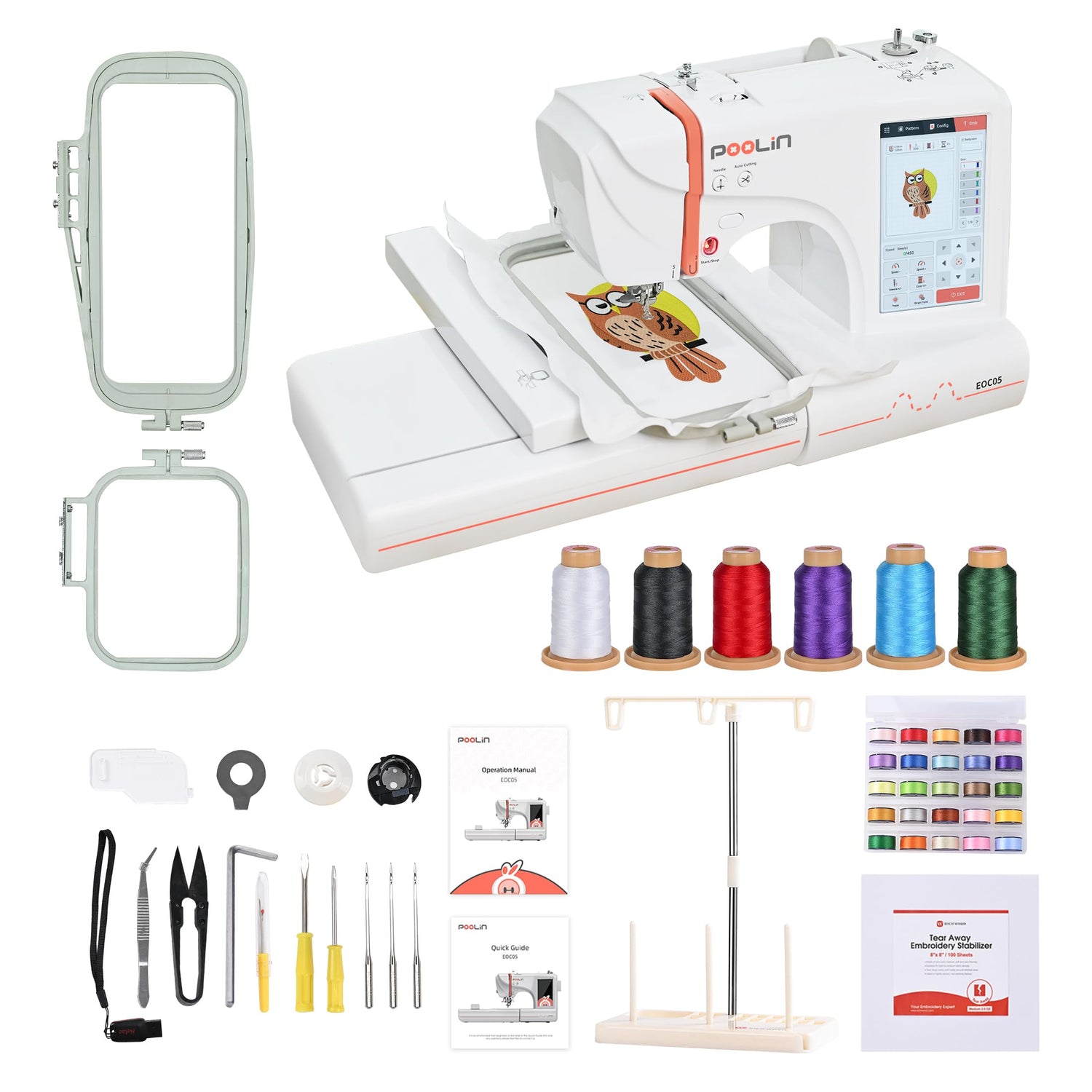 - 【Complete Embroidery Supplies】 EOC05 computerized embroidery machine will come with 6 rolls of polyester threads, multi colored pre-wound bobbins, and stabilizers, which meet most needs for beginners, no need to purchase additional supplies