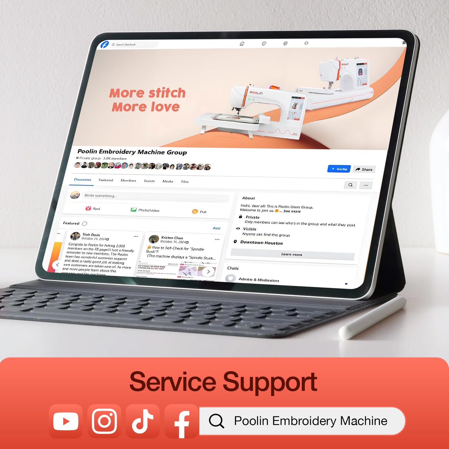 - 【Social Media Support】Search "Poolin Embroidery Machine Groups" on Facebook to join us. We will provide free one-to-one after-sales service from engineers to better start your embroidery career. The official YouTube channel "Poolin" welcomes your follow to get teaching videos and real usage feedback.