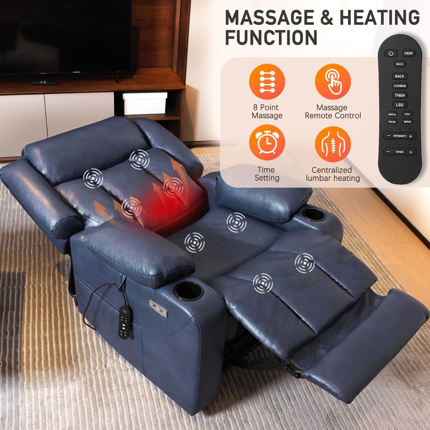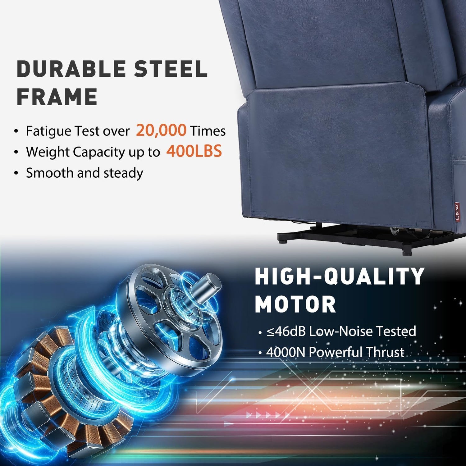 EONIX Dual Motor Oversized Power Lift Recliner Chair for Elderly, 400lbs Heavy Duty Faux Leather Recliner with Massage and Heat, Big and Tall Lay Flat Lift Chair with Cup Holders, SLRY006, Navy Blue