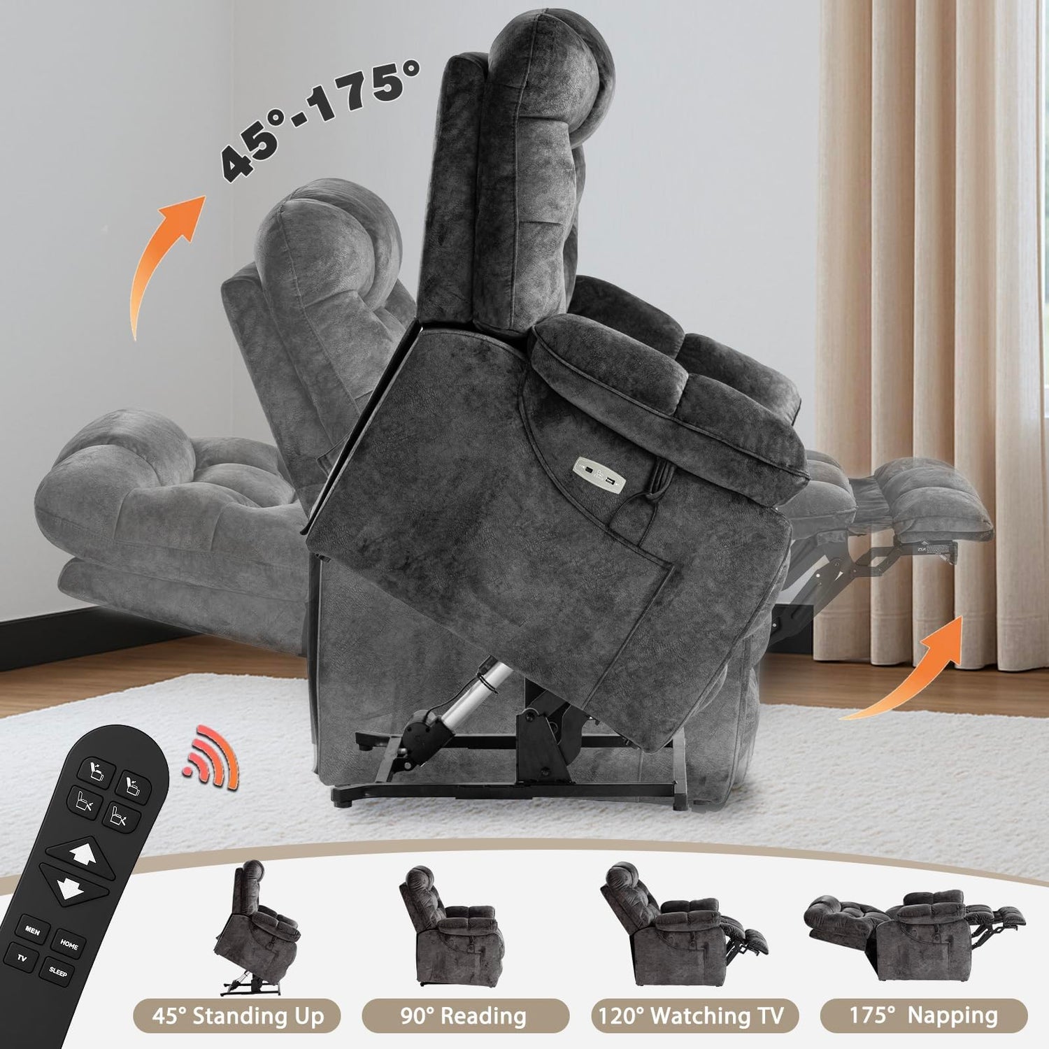 - 【All-Inclusive Convenience Features & Safety】 TYPE C+USB (fast-charge devices) lets you power devices without leaving your seat. 2 side pockets brings an extremely large storage space. One-key reset “home” button: No need to fumble with multiple controls, a single press brings the lift chair recliner back to upright position. OEKO-TEX certified materials: easy-wipe, no skin irritation. The wooden frame of the Power Lift Chair is FSC certified.