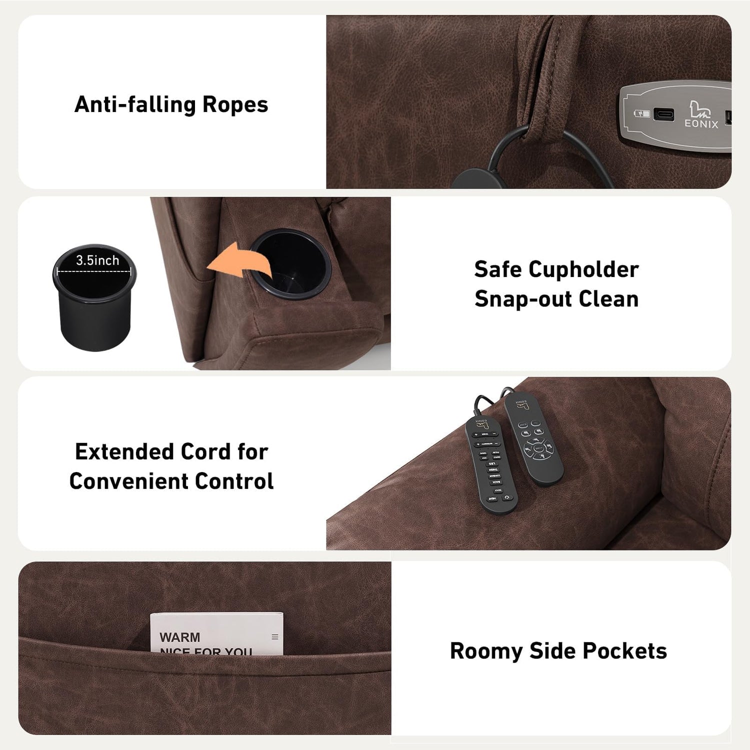 EONIX Triple Motor Lay Flat Power Lift Recliner Chair for Elderly, 400lbs Large Electirc Lift Chair for Living Room, Independent Adjustable Lumbar, Extended Footrest, Hidden Cup Holders, Dark Brown