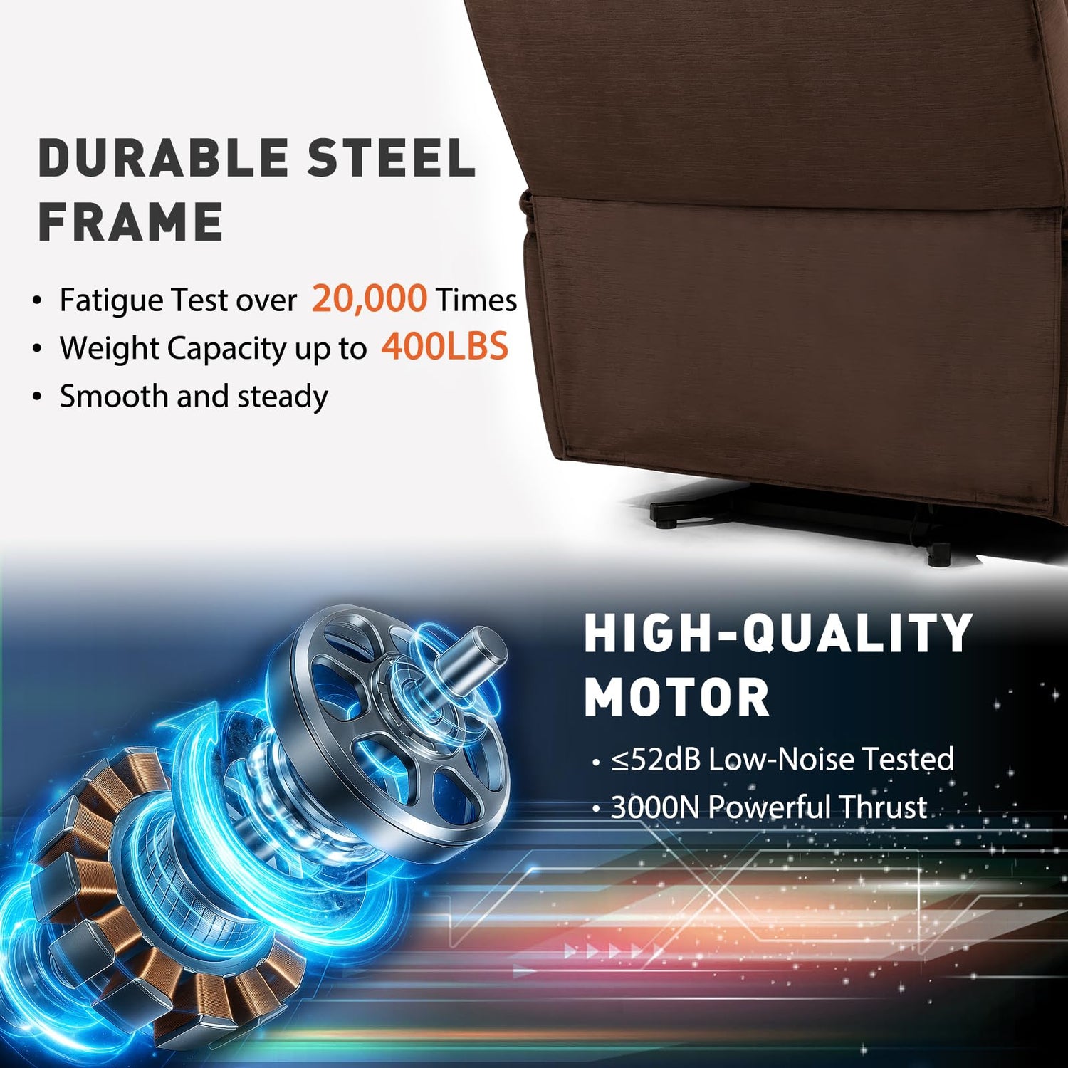 - Durable & Reliable Construction: The chair features a sturdy frame made of durable engineered wood, paired with a heavy-duty alloy steel structure that passes 20,000-cycle/400lbs fatigue testing—helping to maintain stability even during frequent adjustments of the backrest, footrest, and headrest. The upholstery fabric is OEKO-TEX certified (skin-friendly, low irritation), the filling sponge is CertiPUR-US certified (good resilience, no harmful substances), and the the wooden frame of the Power Lift Chair is FSC certified.. These materials not only meet basic eco-friendly standards but also contribute to a longer service life for daily use.