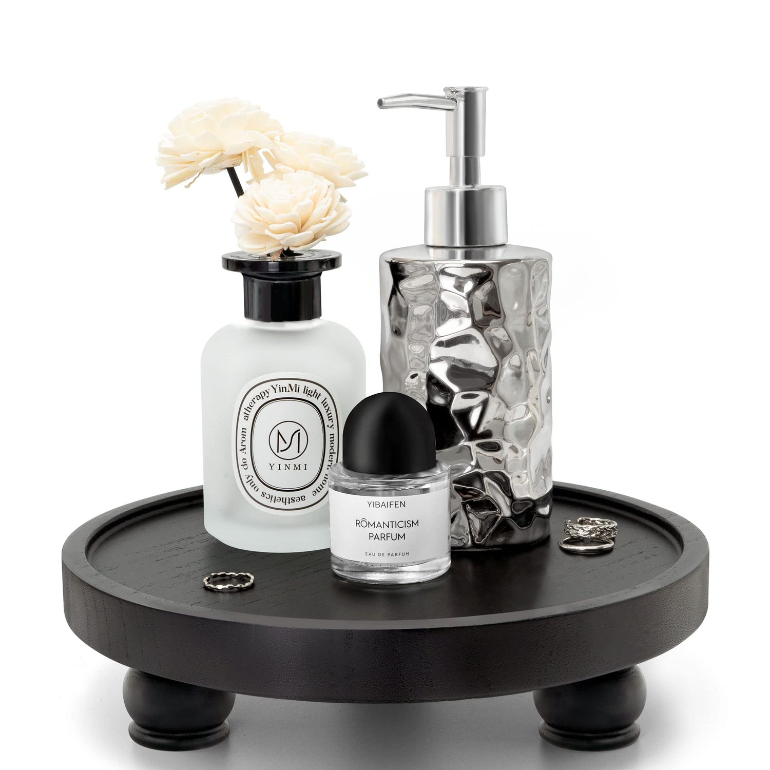 EOSAHR Modern Wood Riser for Display : Farmhouse Pedestal Stand for Kitchen Counter and Home Decor, Round Waterproof Display Tray for Soap on Sink (Black)
