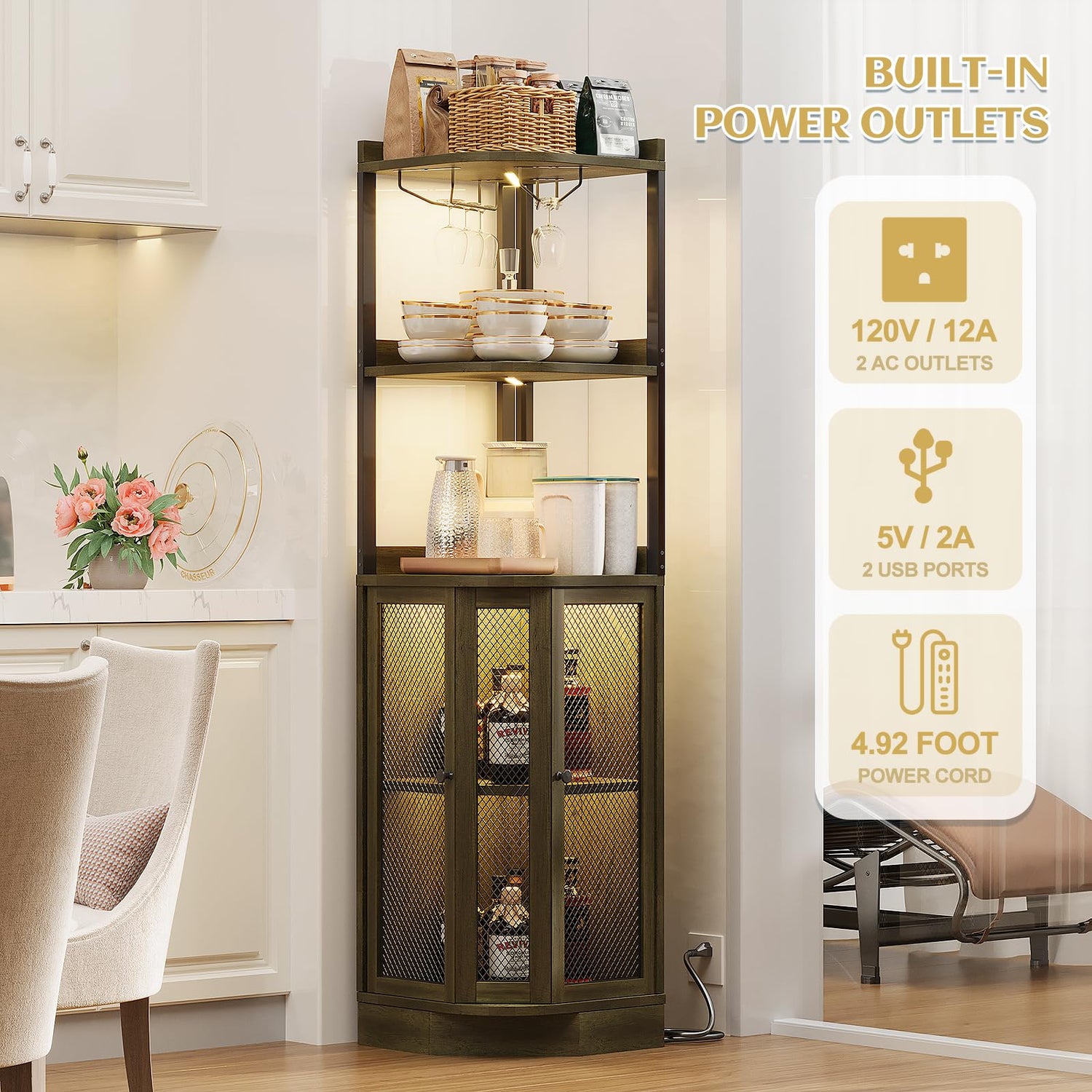 EOYUTLLY Corner Bar Cabinet with Power Outlet and LED Strip, 5-Tier Corner Liquor Wine Display Cabinet for Home, Storage Solution, for Living Room, Kitchen, Home, Gray