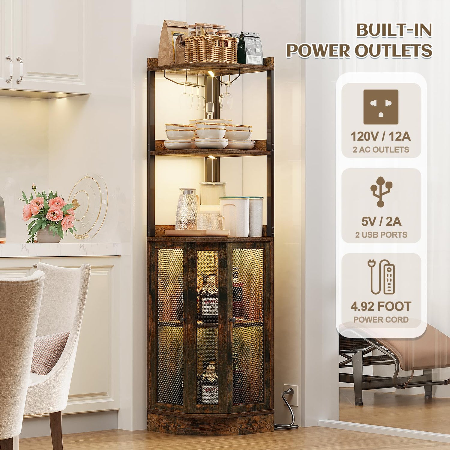 EOYUTLLY Corner Bar Cabinet With Power Outlet and LED Strip, 65" H 5-Tier Liquor Wine Display for Home, Storage Solution for Living Room, Kitchen, Home Bar, Brown