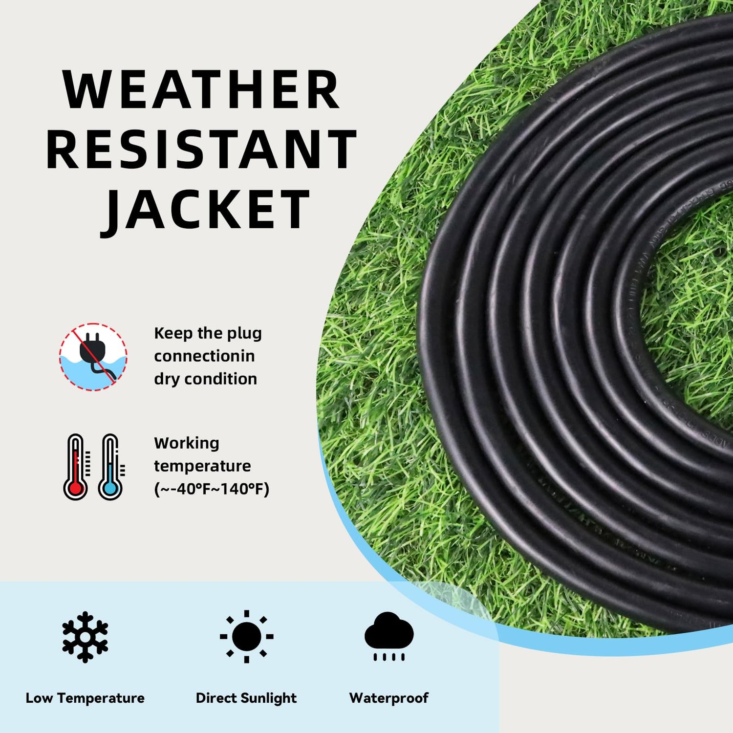 - Safe Cable - UL Listed, 3 prong grounded plug for added safety. Reinforced blades protect prongs from bending or breaking. Remain flexible and tangle-free under all weather conditions and wouldn’t become stiff or crack in cold weather.