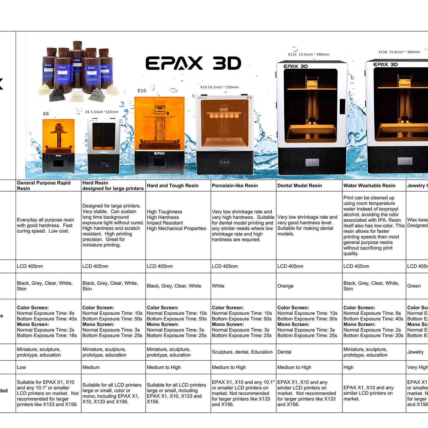 Details: EPAX Hard Resin was specially formulated for large printers. Due to more background light and longer printing time/size, the EPAX hard resin is specially formulated to withstand background light for long time. It is the ideal resin for everyday uses and is the recommended resin for our larger printers such as X10, X133 and X156. It sure also works great with our X1 printers and any other LCD resin printers on market.