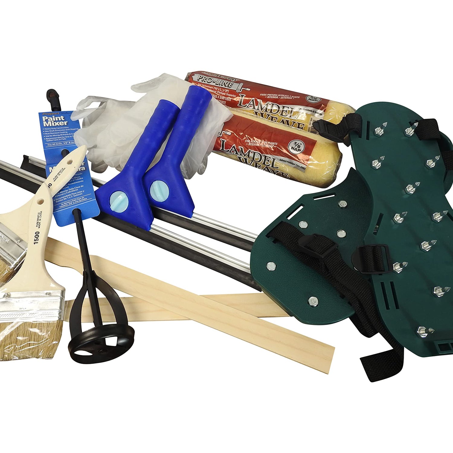 Epoxy-Coat’s garage floor coating is the most durable and longest lasting 100% solids Cycloaliphatic epoxy floor coating kit on the market today. Epoxy-Coat 100% solids floor coating kit is ideal for garage, basement, patio, industrial or commercial concrete or wood floor coating. If you wish to compare the thickness after dried application between Epoxy-Coat and normal epoxies you would need over 2.5X the gallons to equal exactly the thickness of 1 gallon of Epoxy-Coat Floor Coating. You can do it yourself in an afternoon and get a beautiful finish on your garage floor, basement, indoor patio, wood floor and even commercial floor coating applications. In addition to your garage floor coating application, Epoxy-Coat can be used in any room in your house safely, and is ideal for children’s play rooms, bathrooms, basements, laundry rooms, kitchens and mud rooms. Epoxy-Coat can be applied in a single coat with the thickness of 5+ coats of paint with no odor and a dry time of 12 hours. Epoxy-Coat is perfect for rough and pitted concrete floors due to the self-leveling nature and 100% solids non-shrinking formula. A single coat of Epoxy-Coat will patch and coat all in one application. Epoxy-Coat floor coating is the most durable and longest lasting epoxy coating kit of its kind, and it outperforms all other national brands. KIT INCLUDES: 2 gallons Epoxy-Coat Part A Color, 2 gallons of Epoxy-Coat Part B, 2 gallons Epoxy-Coat Part A Clear, 4 Lbs. Decorative Flake, .5 Lbs. of Aluminum Oxide Non-Skid, 9 oz. Prep Solution APPLICATION TOOLS: (2) 3" Brushes, (2) 9" Roller Covers (3/8" Nap), 1 Squeegee, 16" Mechanical Mixer, Pair of Vinyl Gloves, Spiked Shoes, 2 Mixing Sticks