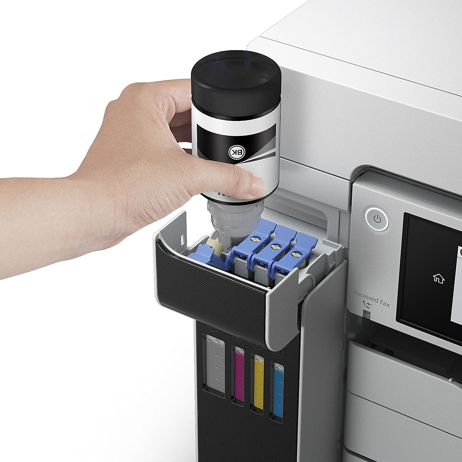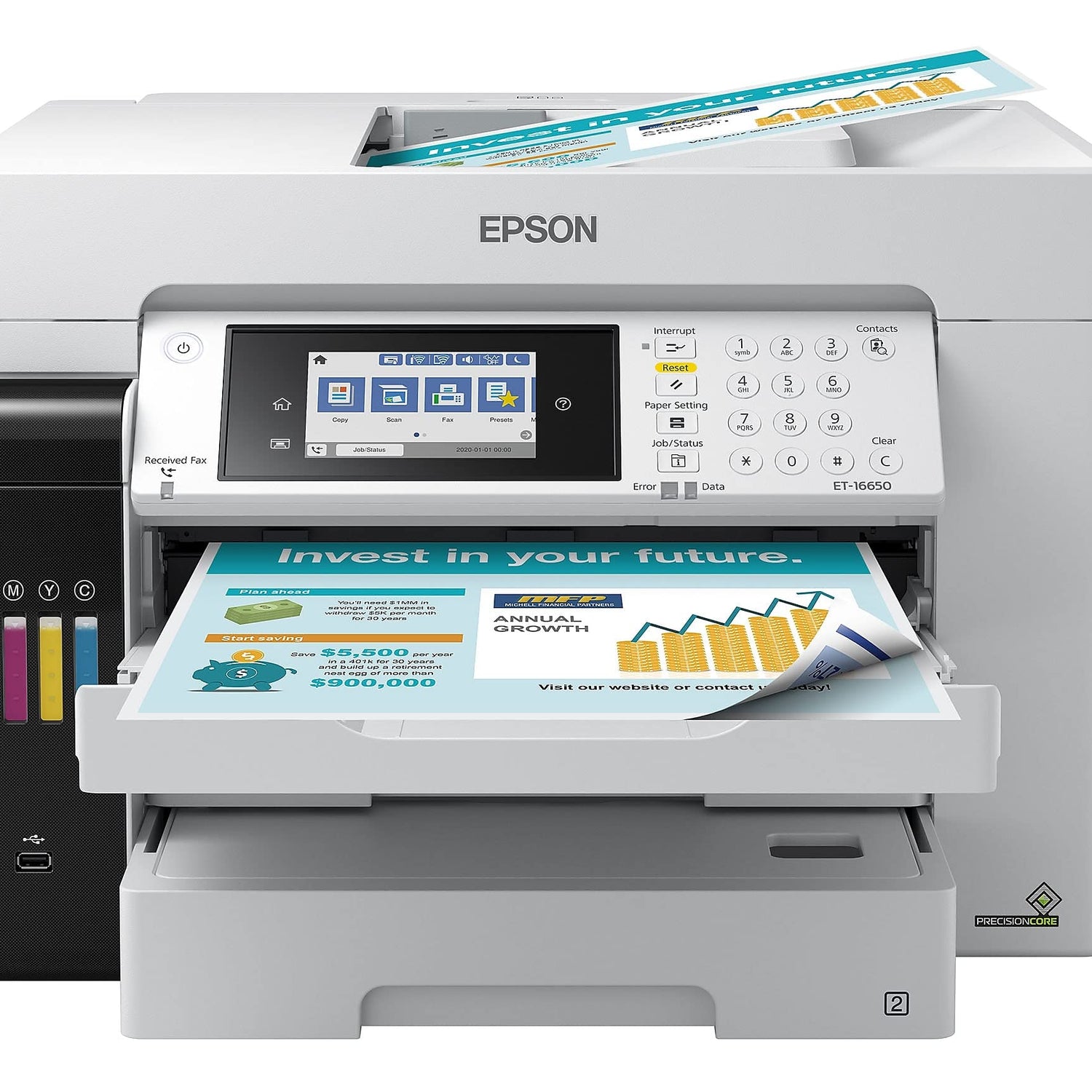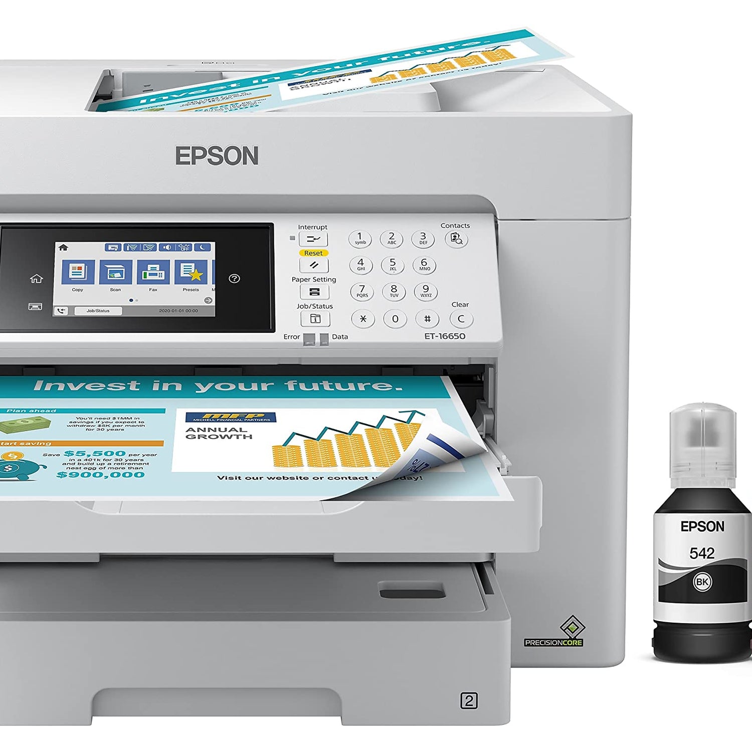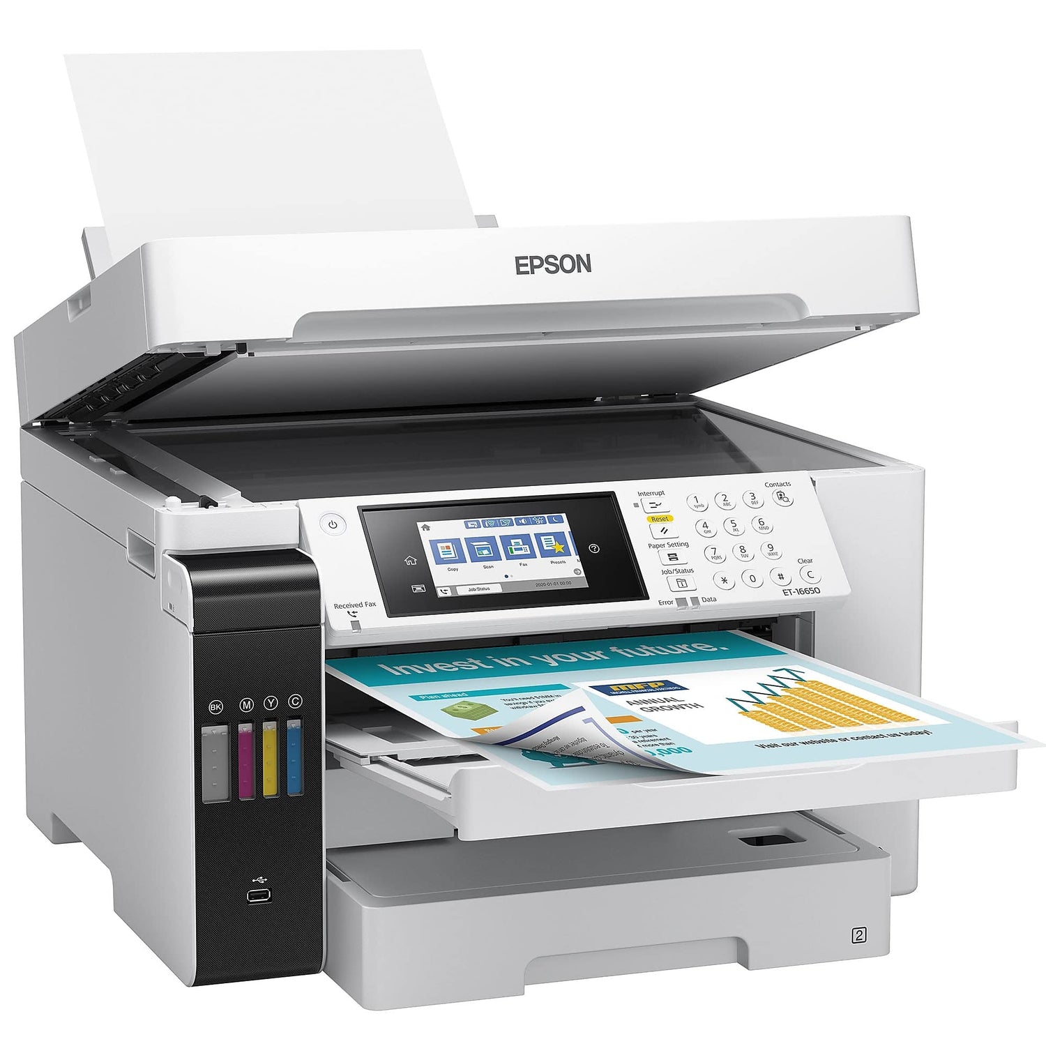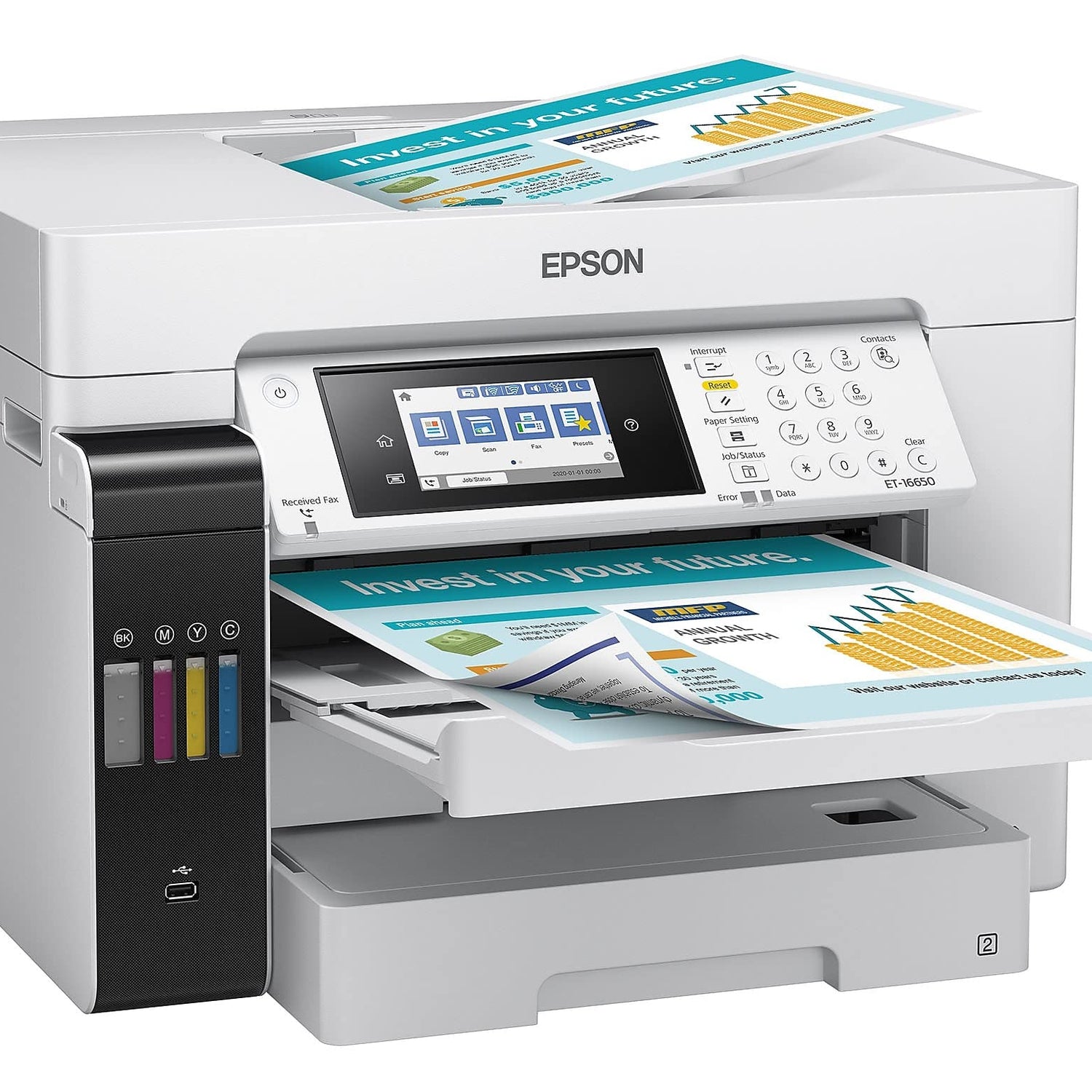 Details: The wide-format EcoTank Pro ET-16650 wireless all-in-one offers fast Cartridge-Free Printing with easy-to-fill supersized ink tanks. You can save up to 80 percent with low-cost replacement ink bottles vs. standard-capacity color laser toner cartridges (1) – about 2 cents per color ISO page versus 14 cents with cartridges (1). PrecisionCore Heat-Free Technology delivers high-volume, print-shop-quality output. This all-in-one with Epson DURABrite pigment-based ink delivers vibrant prints up to 13" x 19" and scans up to 11" x 17". Each replacement ink set included enough ink to print up to 6,000 pages (2). Plus, there’s zero cartridge waste and very low energy consumption (3). The ET-16650 features a 500-sheet front tray paper capacity and rear specialty-paper feed, plus a 4.3" color touchscreen and hands-free voice-activated printing. *The NPD Group, Total Channel Tracking Service, U.S. & Canada, Inkjet SF/MF Printers, Refillable ink tank included, based on units, February 2019 - January 2020. Supertank printers are defined as refillable ink tank printers. **2 Years of Unlimited Ink promo valid for ET-5800, ET-5850, ET-5880, ET-16600 or ET-16650 printers purchased from 10/1/2021 to 3/31/2025. Product must be registered within 30 days of purchase. Limit four 542 ink bottles per claim. Each claim cannot contain multiple bottles of the same color. Retain your empty 542 ink bottle for submission along with rebate form. Promotion applies to ink only. Printer covered by Epson 2-year ltd wnty with registration. For promo participation, you must register your product. See manufacturer's website for details. Ƚ Black and color print speeds are measured in accordance with ISO/IEC 24734. Actual print times will vary based on factors including system configuration, software, and page complexity. 1. Actual savings and costs will vary considerably based on print tasks, print volumes and usage conditions. Savings and cost per ISO page are based on the cost of replacement ink bottles and the cost of enough standard-capacity color laser toner cartridges to achieve the total page yields of the ink bottles using the manufacturers' online prices and yields for the best-selling similarly featured color laser printers, available at retail, priced at $999 or less (USD) with speeds of 40 ppm or less per industry-available data as of July 2019. Savings of up to $600 (USD) and cost per ISO page of about $0.09 (USD) for XL-capacity color laser toner cartridges based on the same methodology. 2. Part of the ink from the included bottles is used for initial setup; yields are lower than those of replacement ink bottles. Replacement and included ink bottle yields based on the ISO/IEC 24712 pattern with Epson’s methodology. Actual ink yields will vary considerably for reasons including images printed, print settings, temperature and humidity. Yields may be lower when printing infrequently or predominantly with one ink color. All ink colors are used for printing and printer maintenance, and all colors must be available for printing. 3. Based on comparing manufacturers’ reported TEC values of the best-selling, similarly featured color laser printers priced about $999 (USD) or less with print speeds of 40 ppm or less as of July 2019. 4 Epson Connect. account and voice-activated account registration required. 5. Most features require an Internet connection to the printer, as well as an Internet- and/or email-enabled device. 6. Wi-Fi CERTIFIED; level of performance subject to the range of the router being used. Wi-Fi Direct may require printer software. 7. 12 months of standard limited warranty or 80,000 plain paper sheets (whichever happens first). For an additional 12-month extended service plan (total of 24 months or 80,000 plain paper sheets, whichever happens first), register your product and use Epson genuine ink bottles. See Limited Warranty for details. 8. SmartWay is an innovative partnership of the U.S. Environmental Protection Agency that reduces greenhouse gases and other air pollutants and improves fuel efficiency.