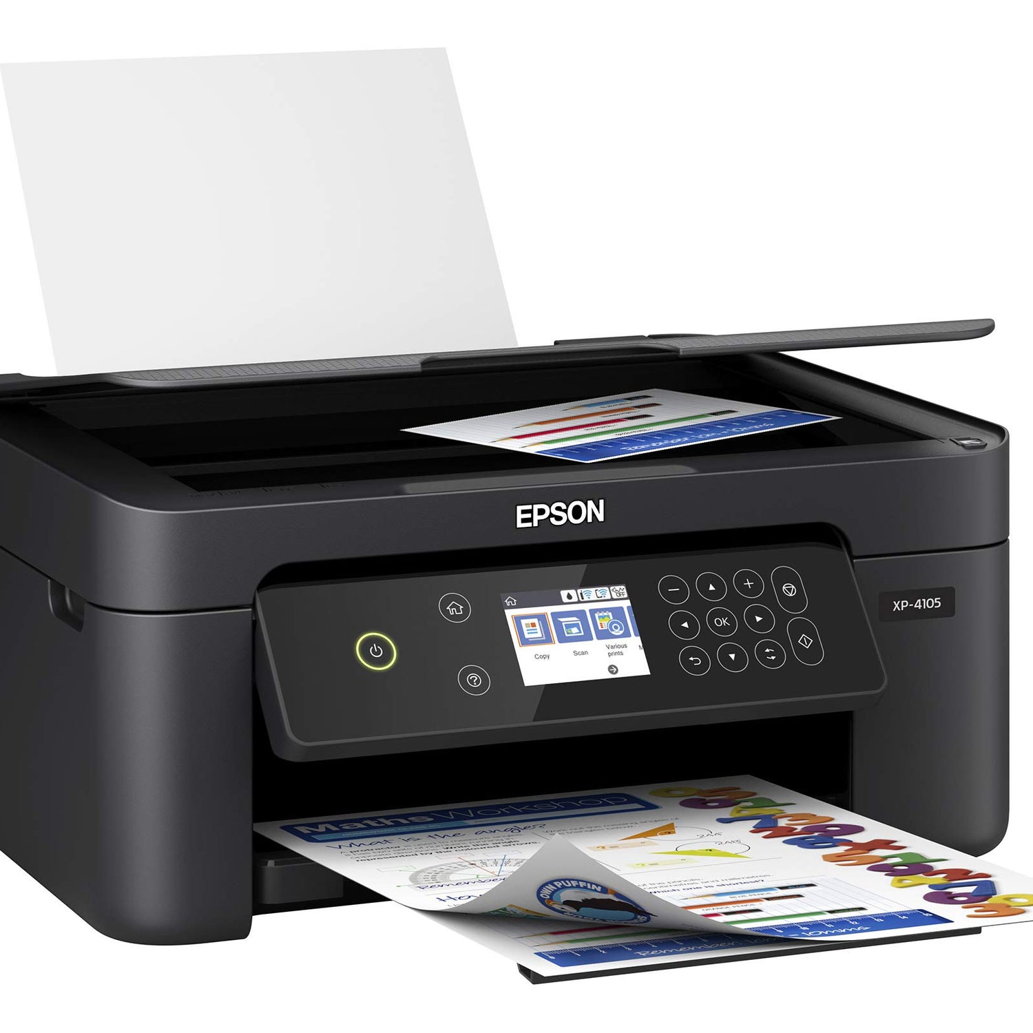 - What's in the box: Expression Home XP-4105 Small-in-One printer; Instruction booklets; CD-ROM with drivers; Power cord; 4 Claria Ink cartridges (1x Black, 1x Cyan, 1x Magenta, 1x Yellow).