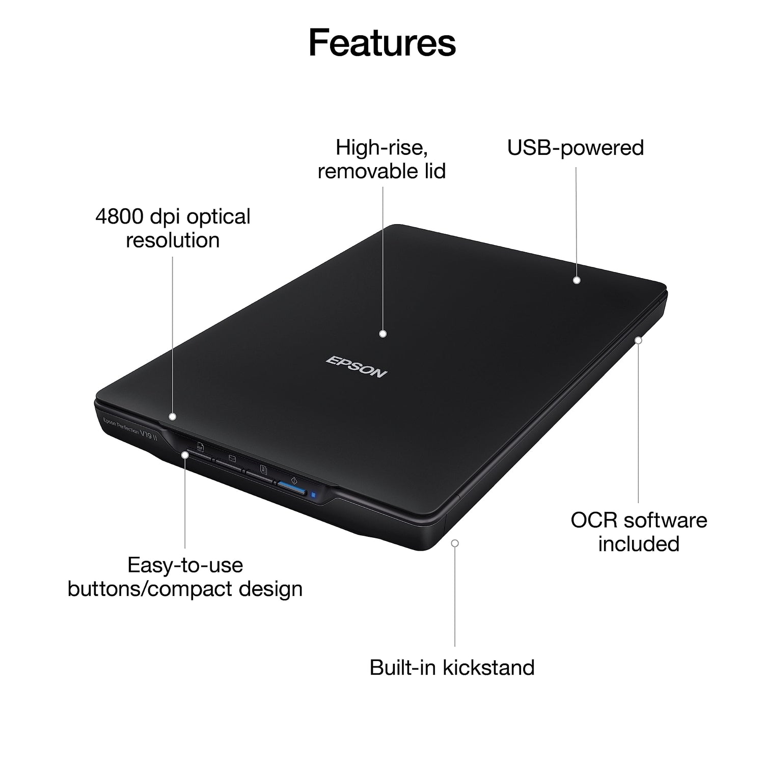 Details: Make scanning simple with the affordable, compact and lightweight Epson Perfection V19 II. With an optical resolution of 4800 dpi (1), this easy-to-use photo scanner delivers amazing clarity and detail at a great value. The V19 II includes convenient one-touch scanning with easy-to-use buttons (2), so you can scan directly to PDF or email with just the touch of a button (2). Get high-quality letter-sized scans in as fast as 10 seconds (3). Moreover, scan photos, artwork, illustrations, books, documents and more with the included Epson ScanSmart software (4). If your photos have faded, you can bring back the color in one click with Easy Photo Fix technology. You can also create editable Microsoft Word, Excel and PowerPoint files (2), or generate searchable PDF files using optical character recognition (OCR) software (2). The V19 II is USB powered for portability, includes a built-in kickstand for space-saving vertical placement and storage, and features a high-rise, removable lid to accommodate bulky items such as books and photo albums.