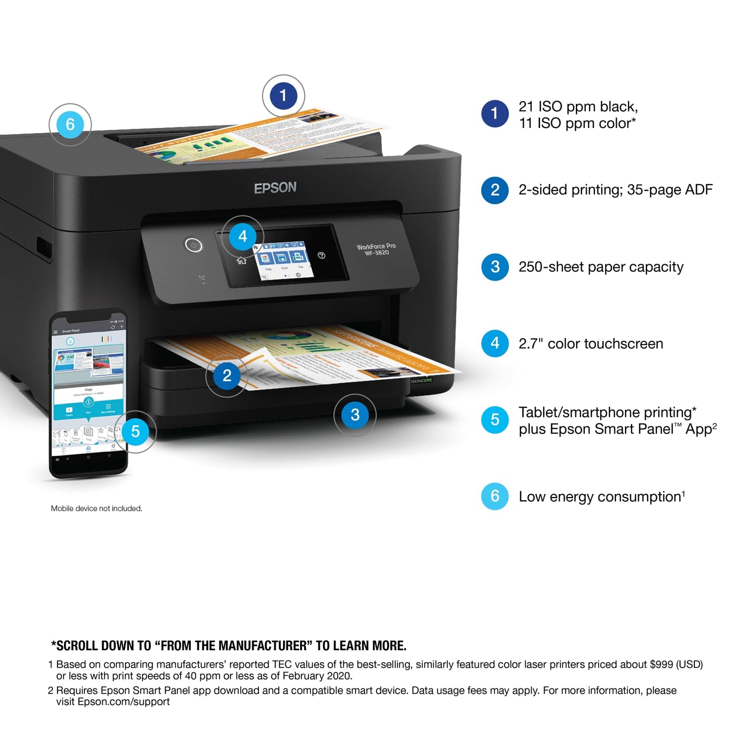 Details: Bring a new level of productivity to your business with the ultra efficient WorkForce Pro WF-3820 all-in-one printer. Designed for high-volume print environments, the WF-3820 delivers precise, professional-quality prints at fast speeds up to 21 (black)/11 (color) ISO ppm ( ) using vibrant DURABrite Ultra instant-dry pigment inks. A breakthrough in business printing, the WF-3820 features Epson’s innovative PrecisionCore Heat-Free Technology designed for enhanced reliability with minimal downtime. Built with convenience in mind, the WF-3820 offers a variety of user-friendly features to support easy, streamlined printing for small workgroups, including auto 2-sided printing, a large, 250-sheet paper capacity, built-in wireless and a 2.7" color touchscreen for quick navigation and control. This product uses only genuine Epson-brand cartridges. Other brands of ink cartridges and ink supplies are not compatible and, even if described as compatible, may not function properly. Black and color print speeds are measured in accordance with ISO/IEC 24734. Actual print times will vary based on factors including system configuration, software, and page complexity. For more information, visit our official site.1. Requires Epson Smart Panel app download and a compatible smart device. Data usage fees may apply. For more information, please visit our official site.2. Most features require an Internet connection to the printer, as well as an Internet- and/or email-enabled device. For a list of Epson Connect enabled printers and compatible devices and apps, visit our official site. 3. Wi-Fi CERTIFIED; level of performance subject to the range of the router being used. Wi-Fi Direct may require printer software.4. Based on comparing manufacturers’ reported TEC values of the best-selling, similarly featured color laser printers priced about similarly or less with print speeds of 40 ppm or less as of February 2020.5. For convenient and reasonable recycling options, visit our official site.6. SmartWay is an innovative partnership of the U.S. Environmental Protection Agency that reduces greenhouse gases and other air pollutants and improves fuel efficiency.